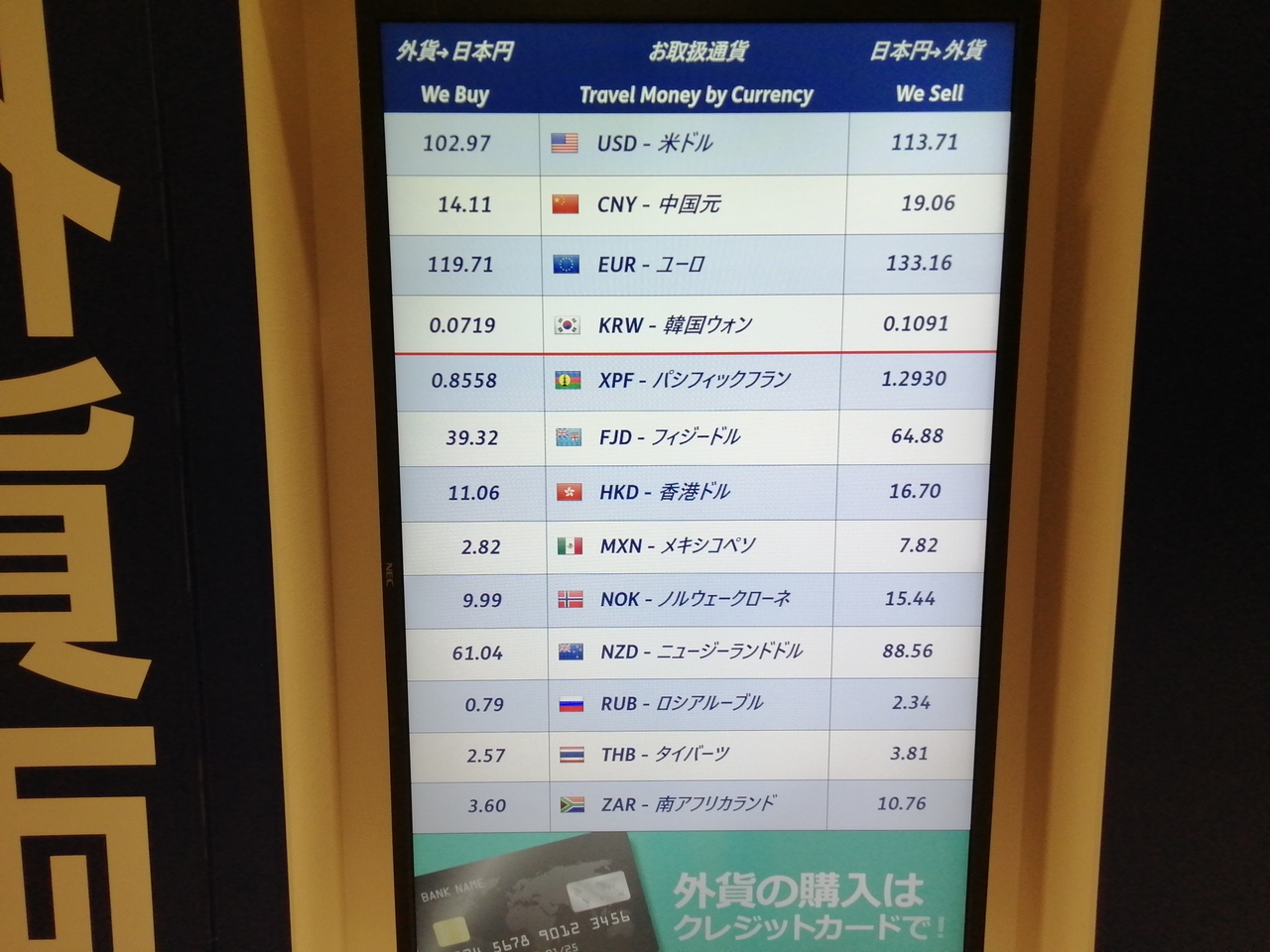 両替といってもT/C→日本円の両替です。この日のキャシュレートは1$→113.71円でしたが、T/Cレートは1$(T/C)→97.55円。実に約14.2%の手数料。200$(T/C)が19510になってしまいました。ちょっと取り過ぎじゃと思うのですが、今どきT/Cなんかはほとんど流通しておらず、持っていても紙くず同然。ほんとに紙くずになる前に両替せざるを得ない立場としては文句は言えないのです。むしろ感謝しなければいけません。あーこれで手持ちのT/Cがようやく全部なくなった。すっきりしました。- 旅行時期