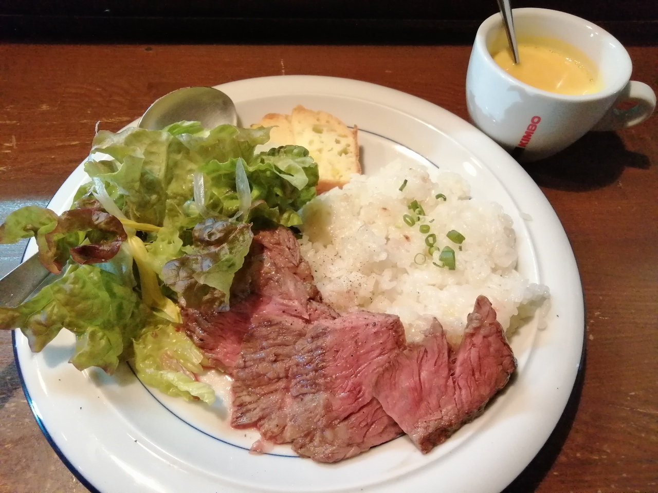 肉の味は薄く、ガーリックライスはガーリック効き過ぎ、カボチャスープは粉っぽかった。他のクチコミサイトの写真よりもライス、肉ともに少なかったです。まぁ550円ならこんなもんかなと。5食が終了したら通常料金の1100円でも出しているようです。この料理を1100円で出すとは思えないのでランチ用にケチられちゃったかなと思います。