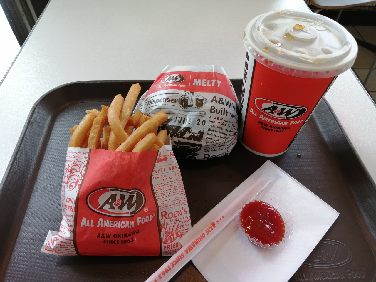 「メルティ」のシングルをコンボでオーダー(税込850円)。パテとベーコンとチーズが入っているやつです。そしてルートビア。ルートビアも人生初。こんな味だったんですね~。おかわりOKなんで2杯飲んじゃいました。久々のハンバーガーはうまいですがやはりジャンクフード。ポテトも食べきったら気持ち悪くなってしまいました。また1年後でいいや…。- 旅行時期