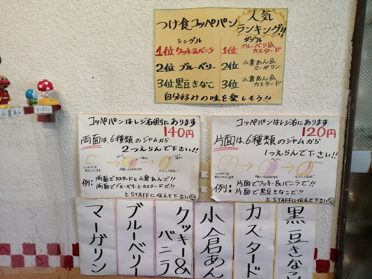 以前は老舗の菓子店だったようですが、今はパン屋としてオープンしています。コッペパンがウリと聞いたので出かけてみました。店内は素朴でどこか暖かみのあるパンがずらり。その一画にコッペパンコーナーがあります。その名も“つけ食コッペパン”。6種類のトッピングから選べます(写真参照)。シングルは文字通り1種類、ダブルは両面に1種類ずつ。人気ランキングが書かれているので選びやすいです。