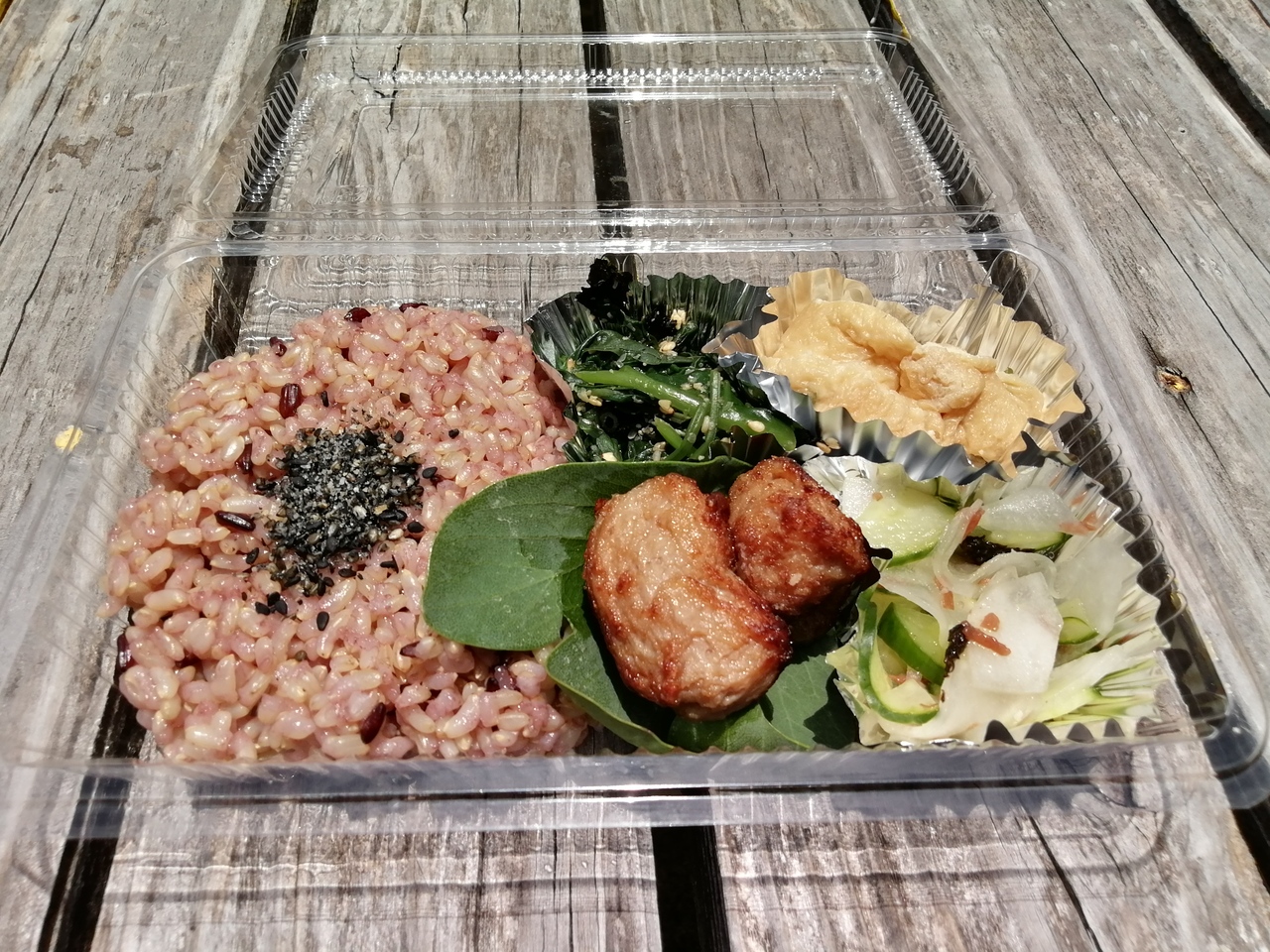 マクロビオティックカフェと自然食品、雑貨販売の店です。マクロビオティック…もちろん知ってますよ。なんか身体によさそう的な…。あいにくそんな知識しか持ち合わせていませんが、気軽に食べられる“マクロビ弁当”なるものがあると聞き、健康のためならということでおじゃましてみました。ランチの始まる12:00に行き「VEGAN ハーフ弁当(480円)」をテイクアウトでオーダー。10分待ちでした。内容は…雑穀米?青菜の和え物、酢の物、麩、揚げ物。もちろんベジタリアンです。お味はおいしいですが、ハーフだと量が足りませんね。まぁ、そういうモノなんですが…。身体にはとてもよさそうです。これを食べ続けたら絶対痩せると思います。