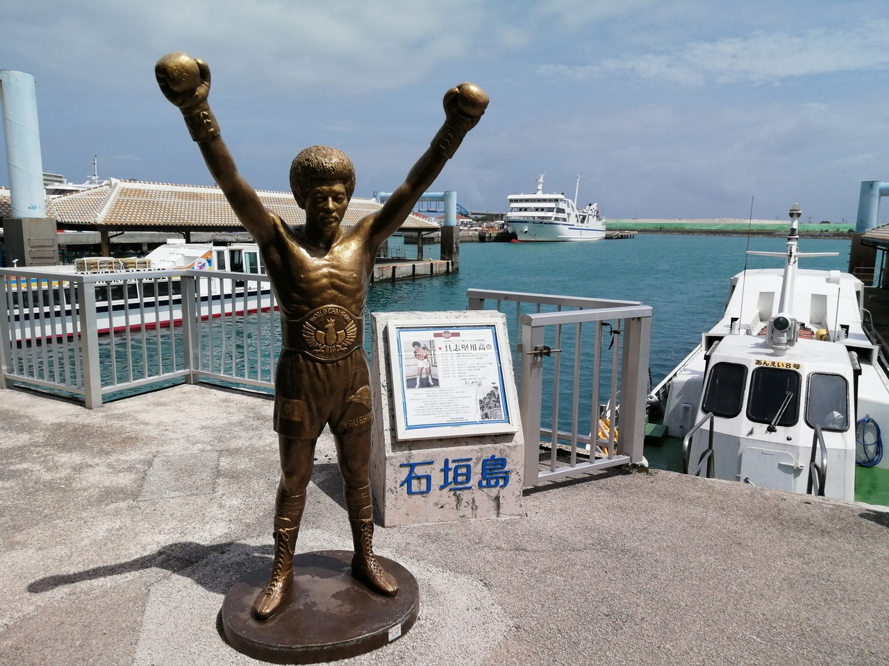 石垣離島ターミナルにある石垣島出身の具志堅用高さんの像。ベタ過ぎる観光スポットですが、皆写真を撮って終わりでしょう。“テレビに出てる面白いおじさん”としか認知していなかった人は驚くんじゃないでしょうか。そして手に付けたグローブ、腰に巻いたチャンピオンベルト、経歴板を見てみると…