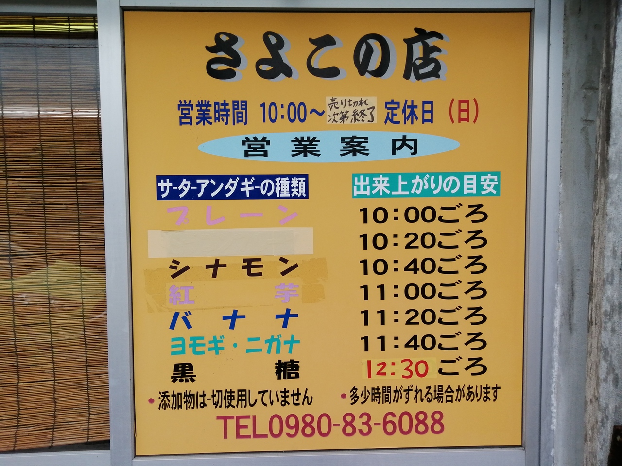 サーターアンダギーは全6種類。順番に揚げていくようで、出来上がりの目安時間が貼り出されています(写真参照)。開店と同時に行っても1種類しか買えないので、最後の黒糖が出来上がる時間を見計らって12:15頃におじゃましました。したら…「プレーン」と「ヨモギ・ニガナ」がちょろちょろっと残るのみであとは完売。黒糖は?と尋ねると13:30とのこと。別の日に出直そうかと思いましたが、出直そうかと思いましたが、せっかくなので1つずつ買いました。一度で全種類はまず買えません(運次第)。いったい何時に行ったらいいものやら…。