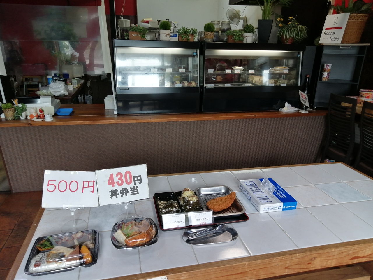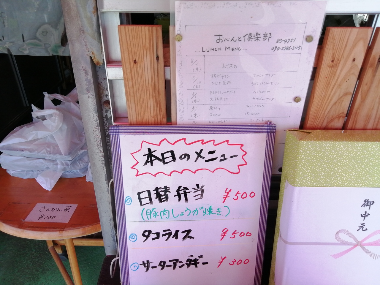 登野城漁港の目の前にあるお弁当屋さんです。店先にその週の日替弁当の内容が貼り出されていてとても親切です。タコライスは毎日あります。どちらも500円。
