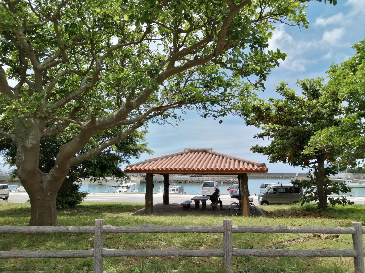 石垣に来てからまだ食べていないタコライスをチョイス。漁港との間にある「マンタ公園」にある東屋でいただきました。店のほぼ目の前です。