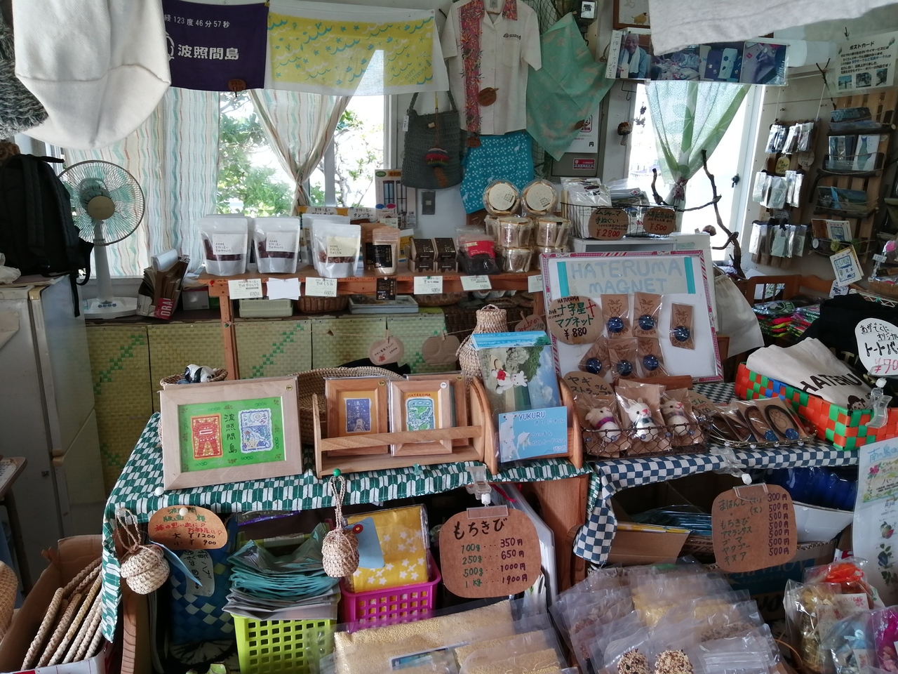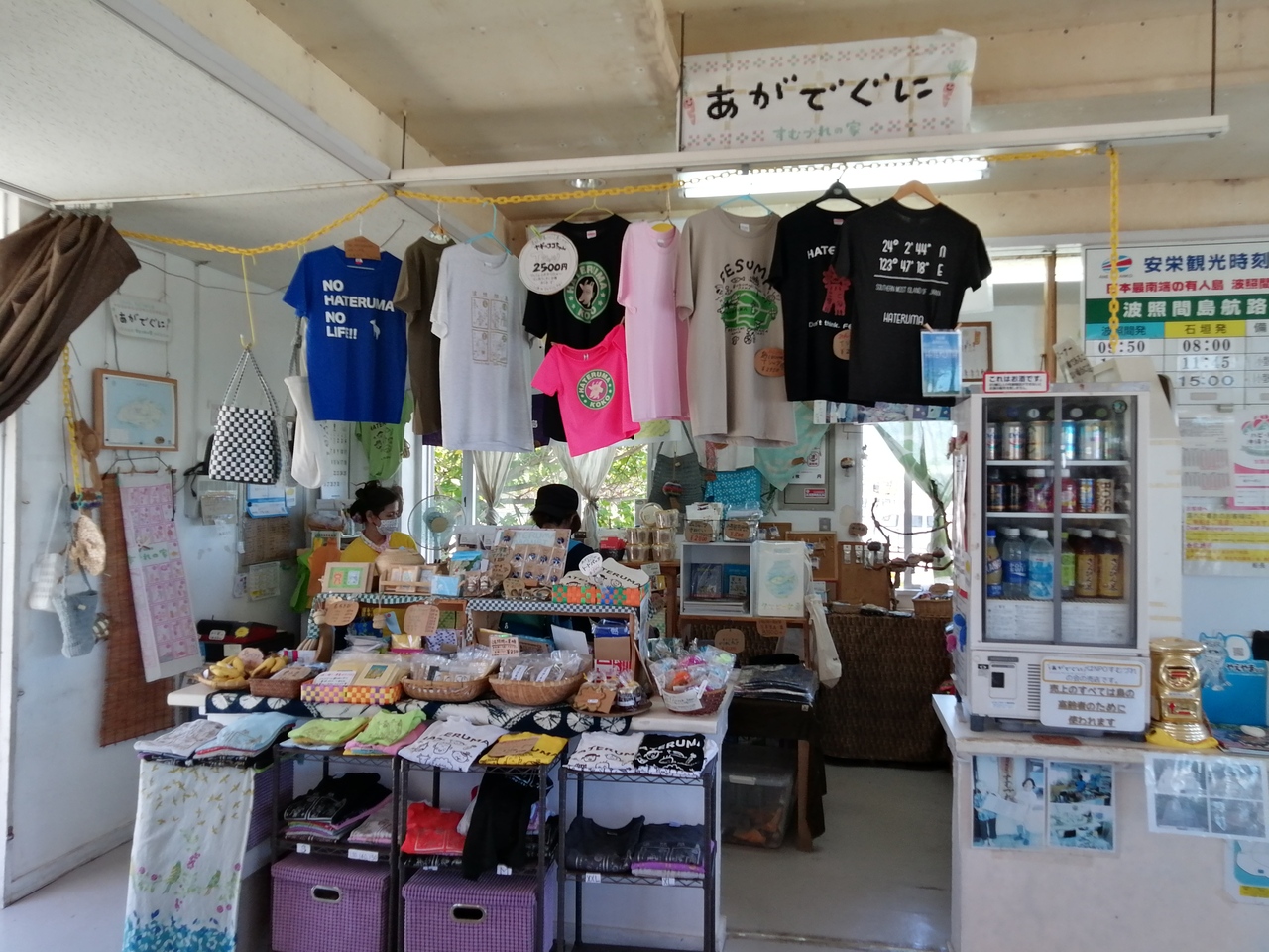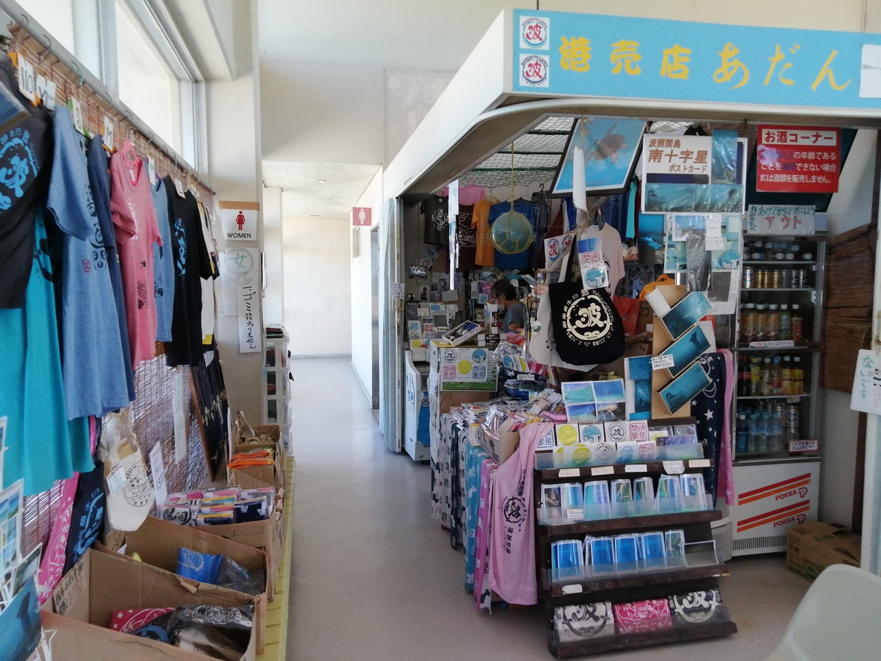 波照間港の旅客ターミナル内にある売店兼土産物屋です。店構えも小さく、今どきポストカード推しであまりやる気がないのかなと思いましたが、いやいやとんでもない。よーく見ると“波”の文字が入ったTシャツやらトートバッグやらステッカーが…。さらによーく見ると「あだん」の文字も。そう、これらはすべてこの店のオリジナル商品です。なやなやのヤリ手です。売れているかどうかはわかりませんが…。“波”と書かれていても決して泡盛の「泡波」ブランドではありませんので、お間違えなく。