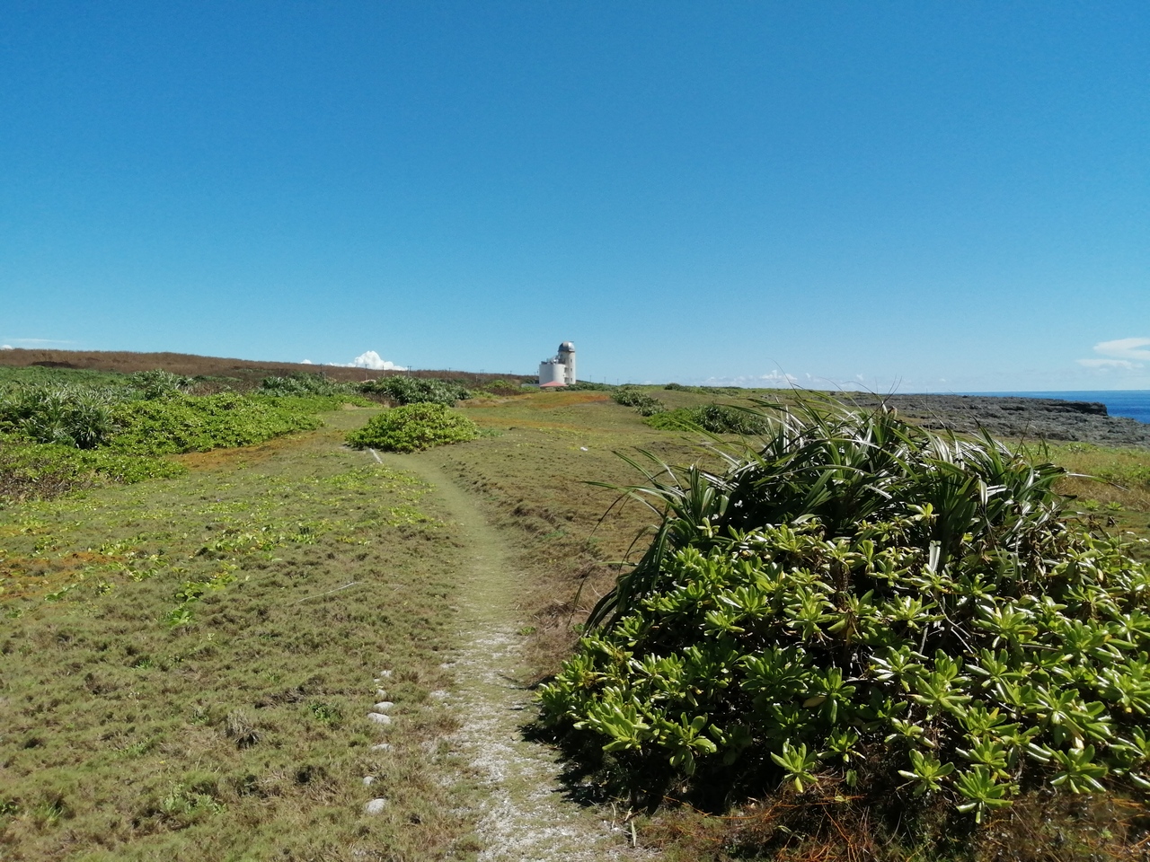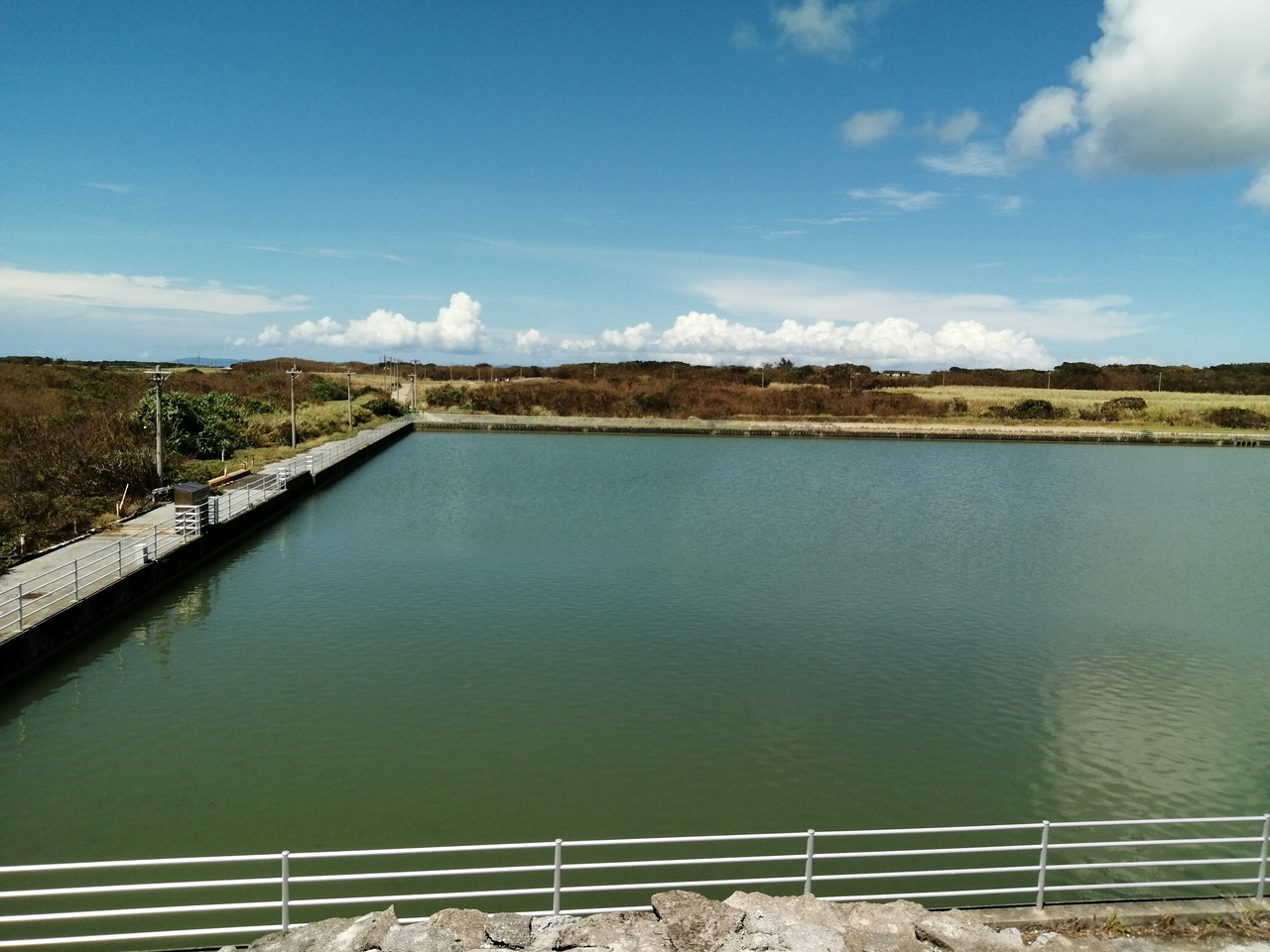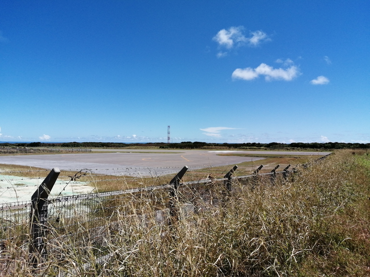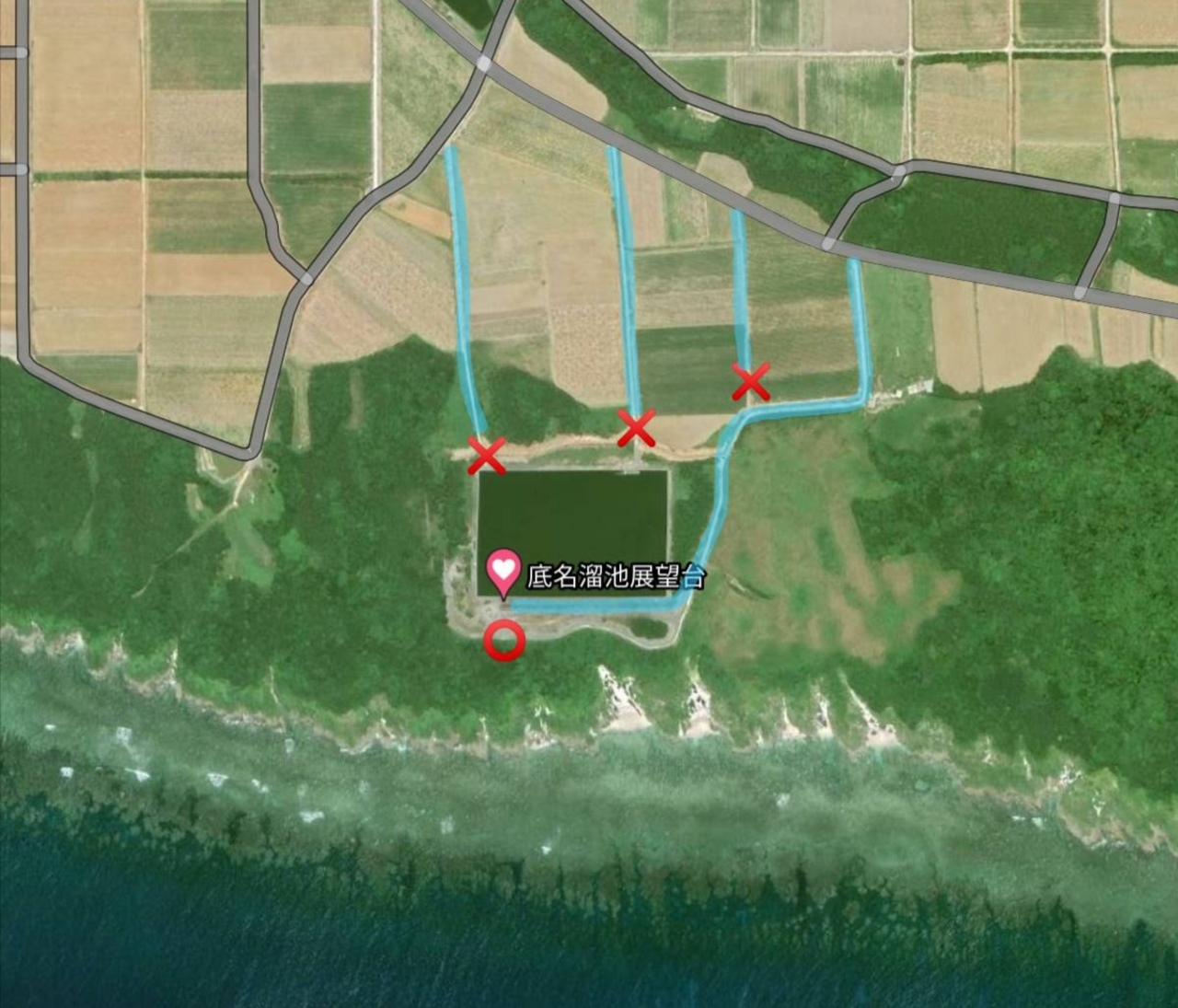 島の南西部、貯水池の南側の海沿いにある展望台です。私は展望台の西側からやって来たのでグーグルマップで最短経路を確認し、池の北側からアプローチ。しかし池の手前でフェンスの柵に阻まれ進入不可。結局来た道を戻り、池の西側、南側を通ってたどり着きました(写真の地図を参照)。
