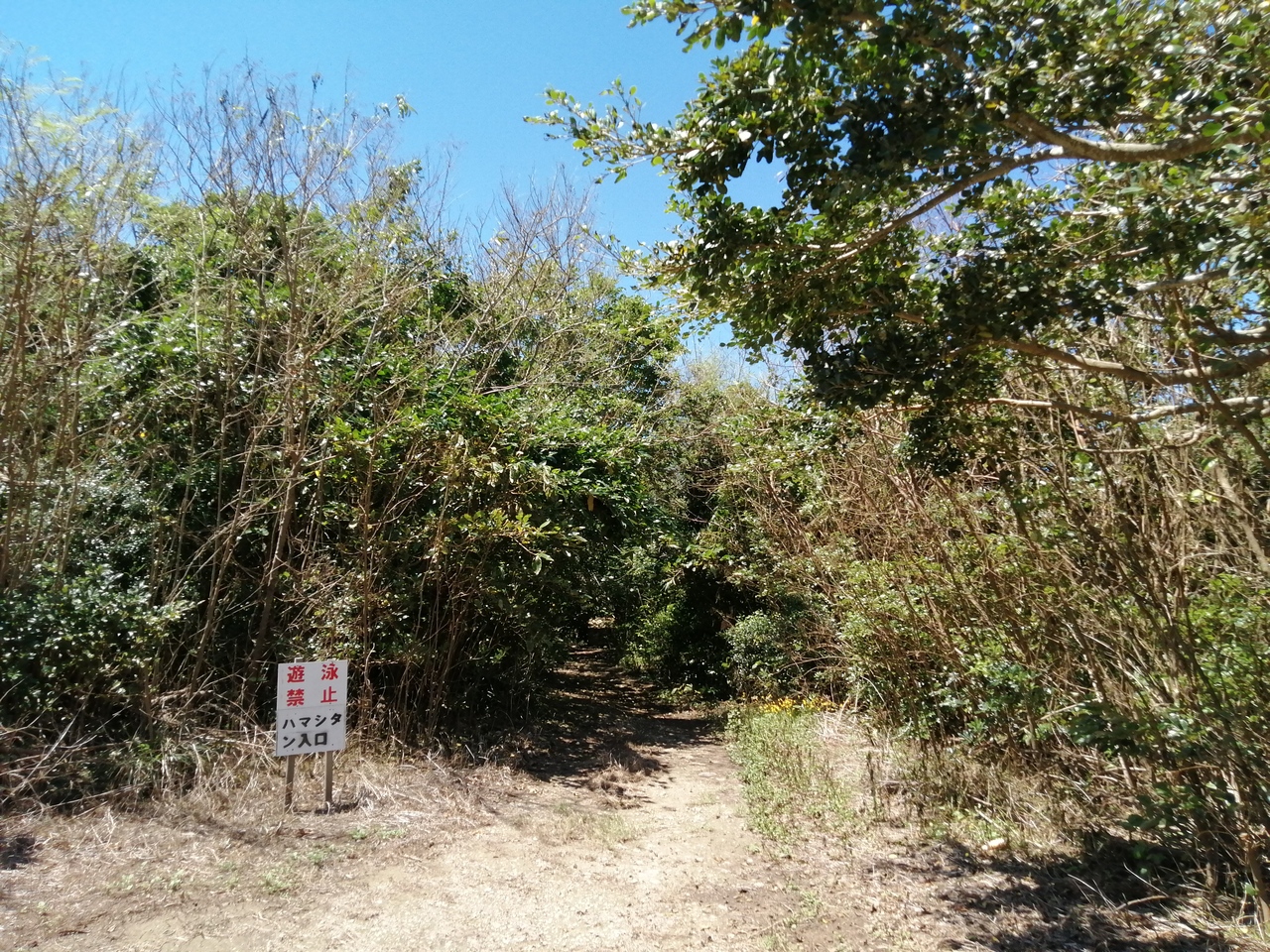 ペー浜だけに行きたいのなら道路で最寄りポイントまで行き、林の中の小道(約300m)を抜けたほうが楽に行けます。小道の入口には「ペー浜」の文字はありませんが、「車両進入禁止」と書かれた看板があります。