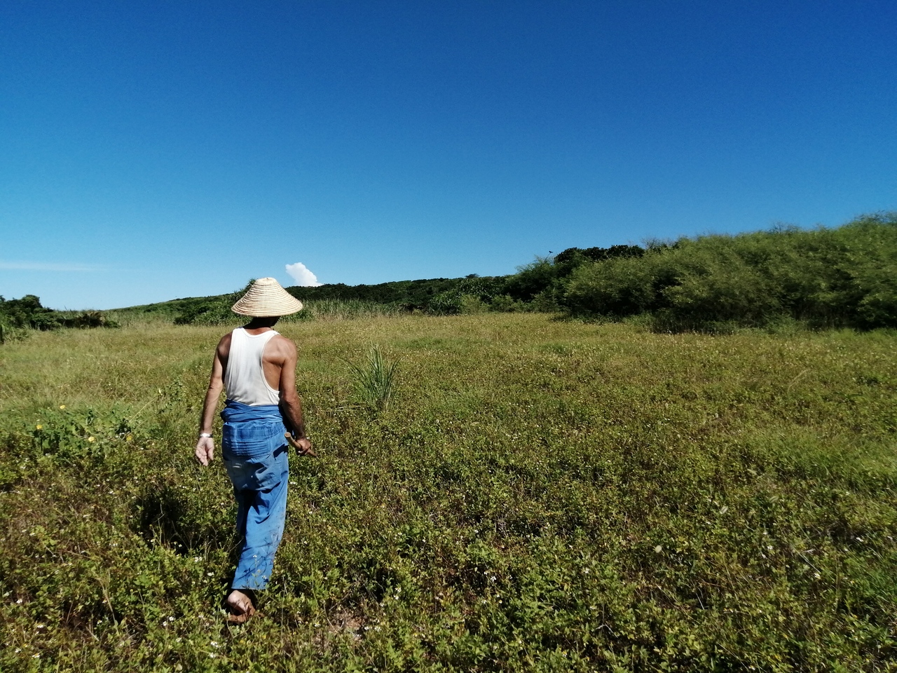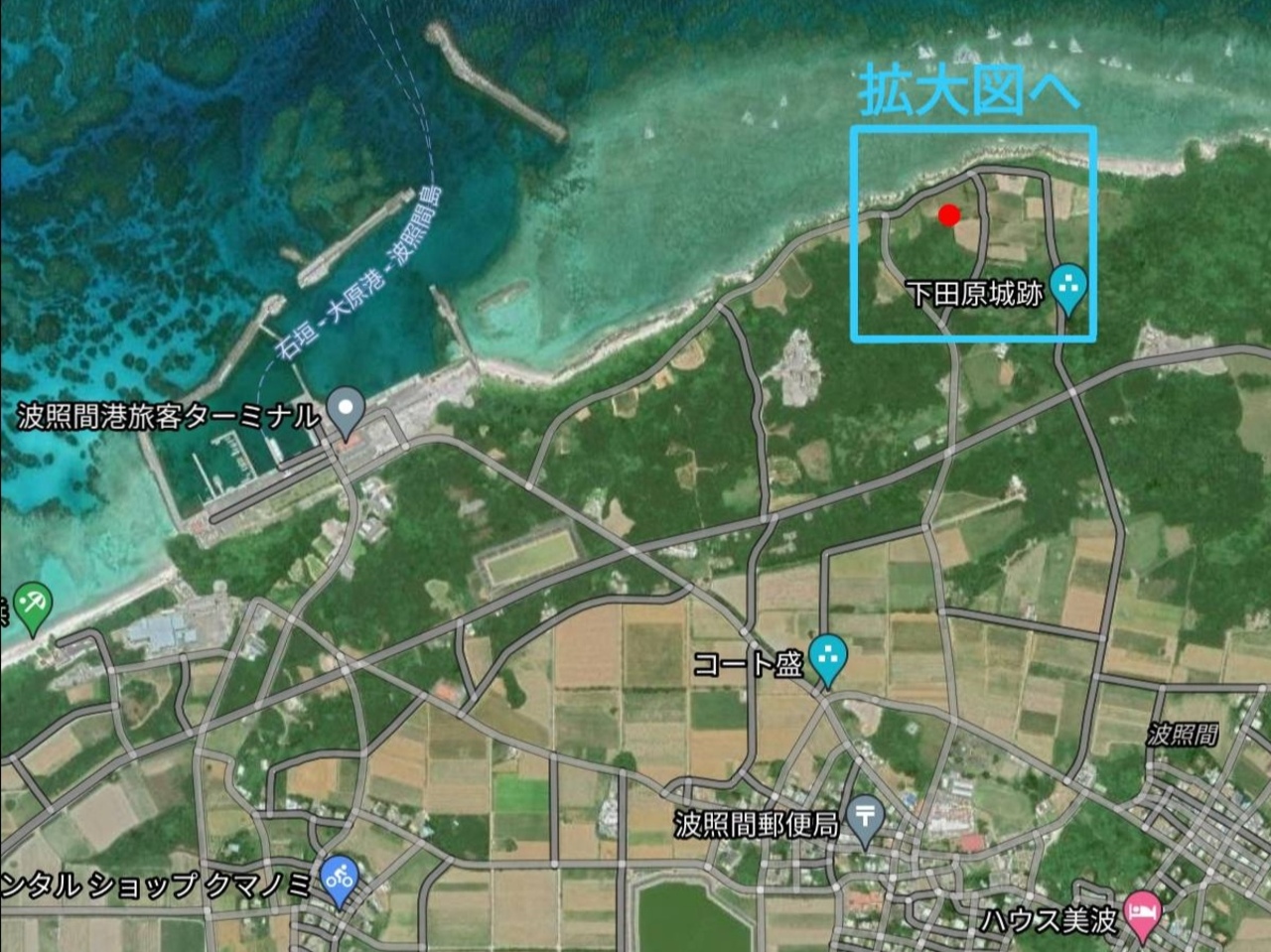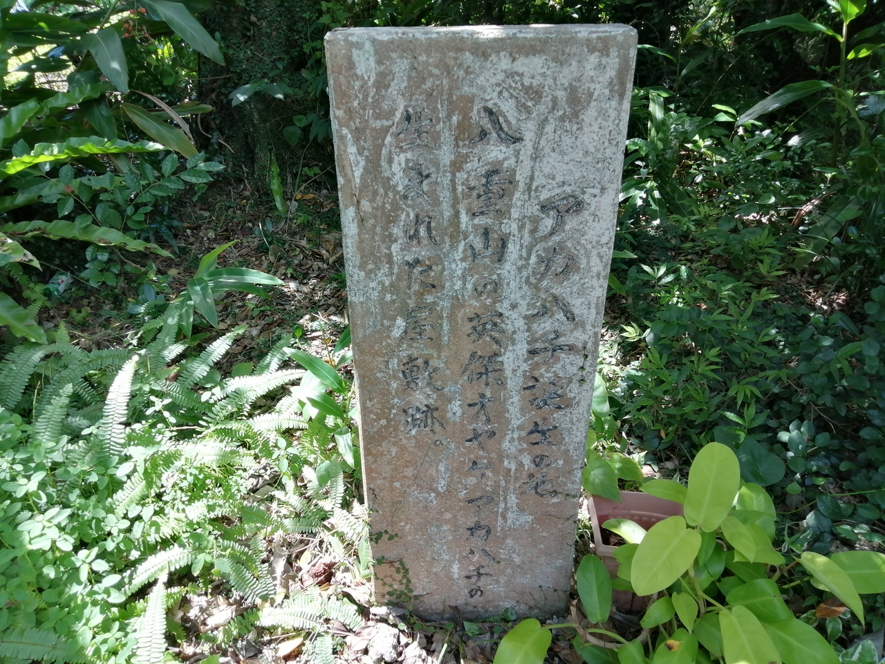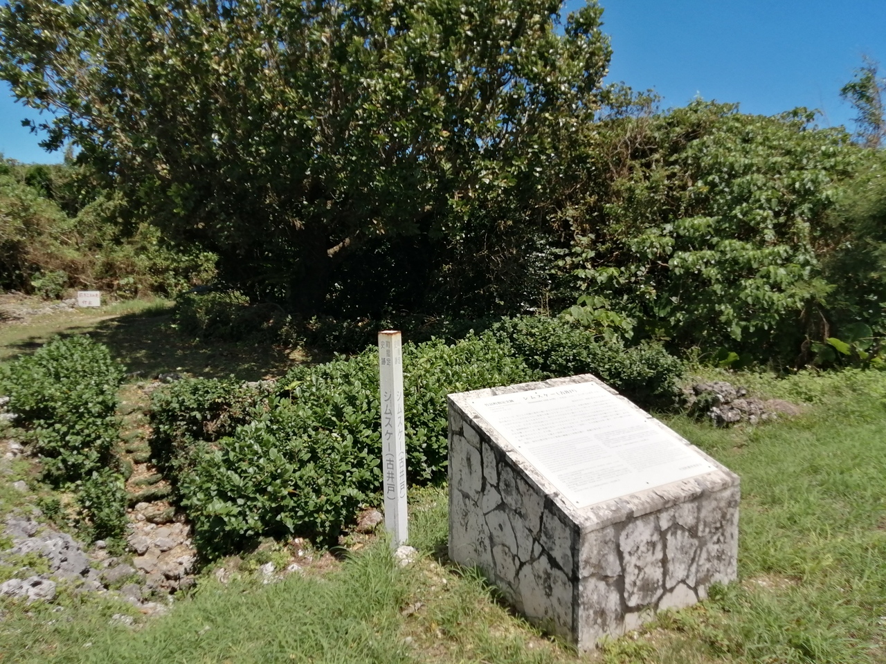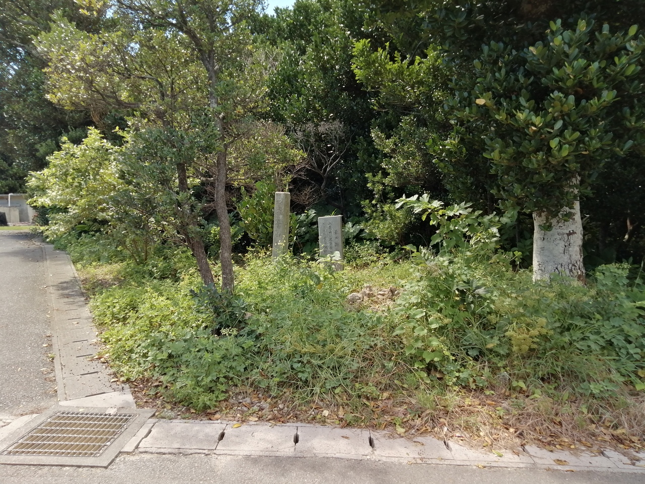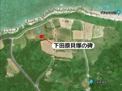 観光マップやネット情報ではぼやっとした位置しか記されていません。それを頼りに探してみましたが、案内看板などはまったくないので場所が特定できませんでした。近所にたまたまいた島民の方に尋ねてみると…案内されてようやくわかりました。貝塚は周辺一体に広がっているようですが、“碑”の位置が特定できました。個人ではほぼ100%たどり着けないと思います。とにかくわかりにくい。写真を参照して下さい。
