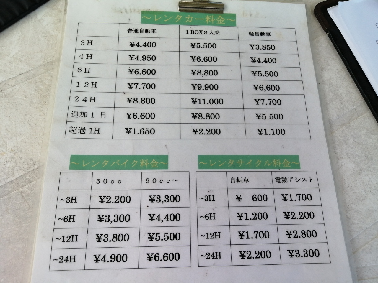 レンタカー、レンタバイク、レンタサイクルの料金表を貼っておきます(2021年9月)。石垣島からの船が着く時間にしかスタッフはいません。それ以外の時間は閉まっており、借りることはできません。返す時は無人でも置いておけばOKです。- 旅行時期