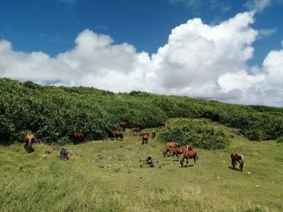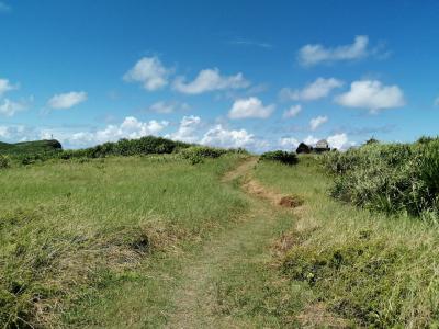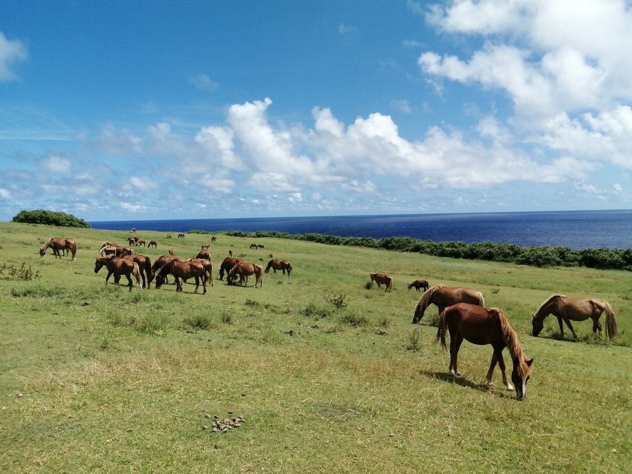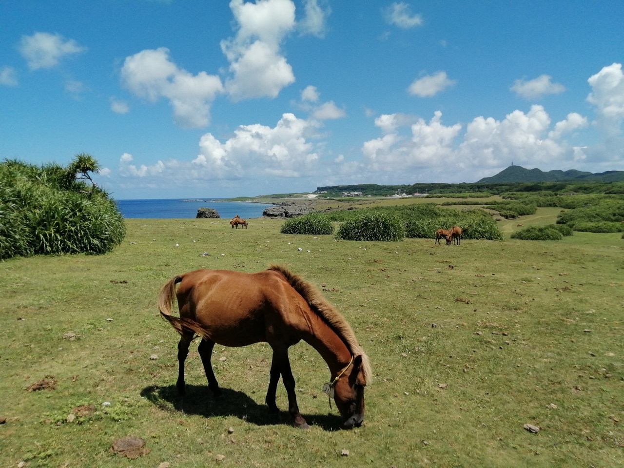 島の南西部、海岸沿いの道路沿い一帯に広がる大牧場です。満喫するために比川から久部良までこの道を歩いてみました。距離は5.5kmほどですが、事実上の牧場部分は2.5kmほどでしょうか。青い海、青い空、緑の草原、そして与那国馬…。これぞ、“ザ・与那国島”の風景。たっぷりと体感できました。