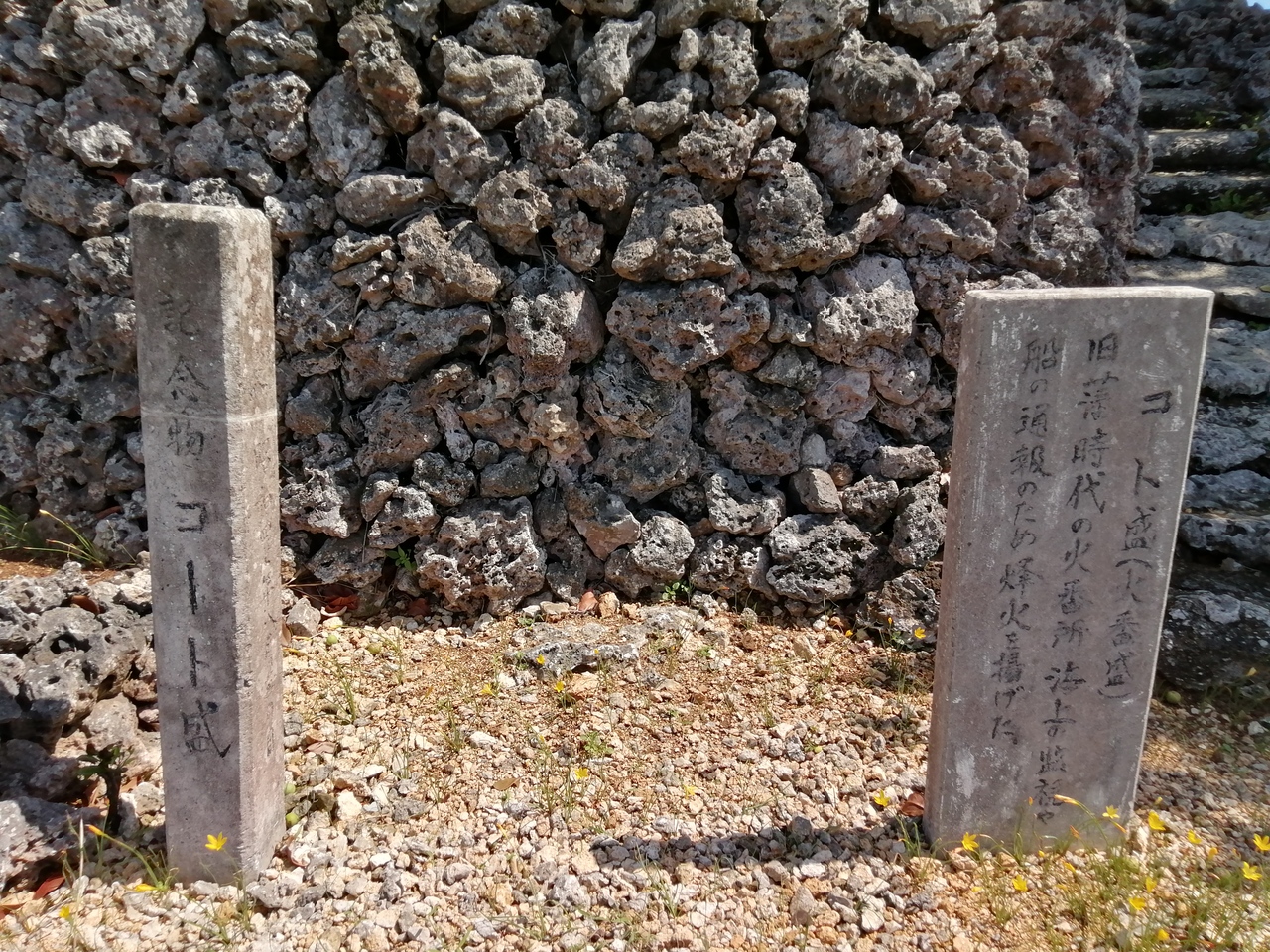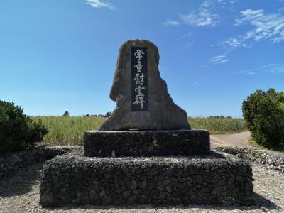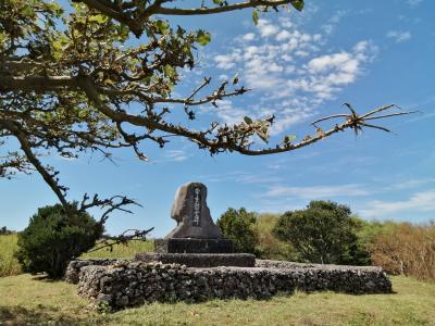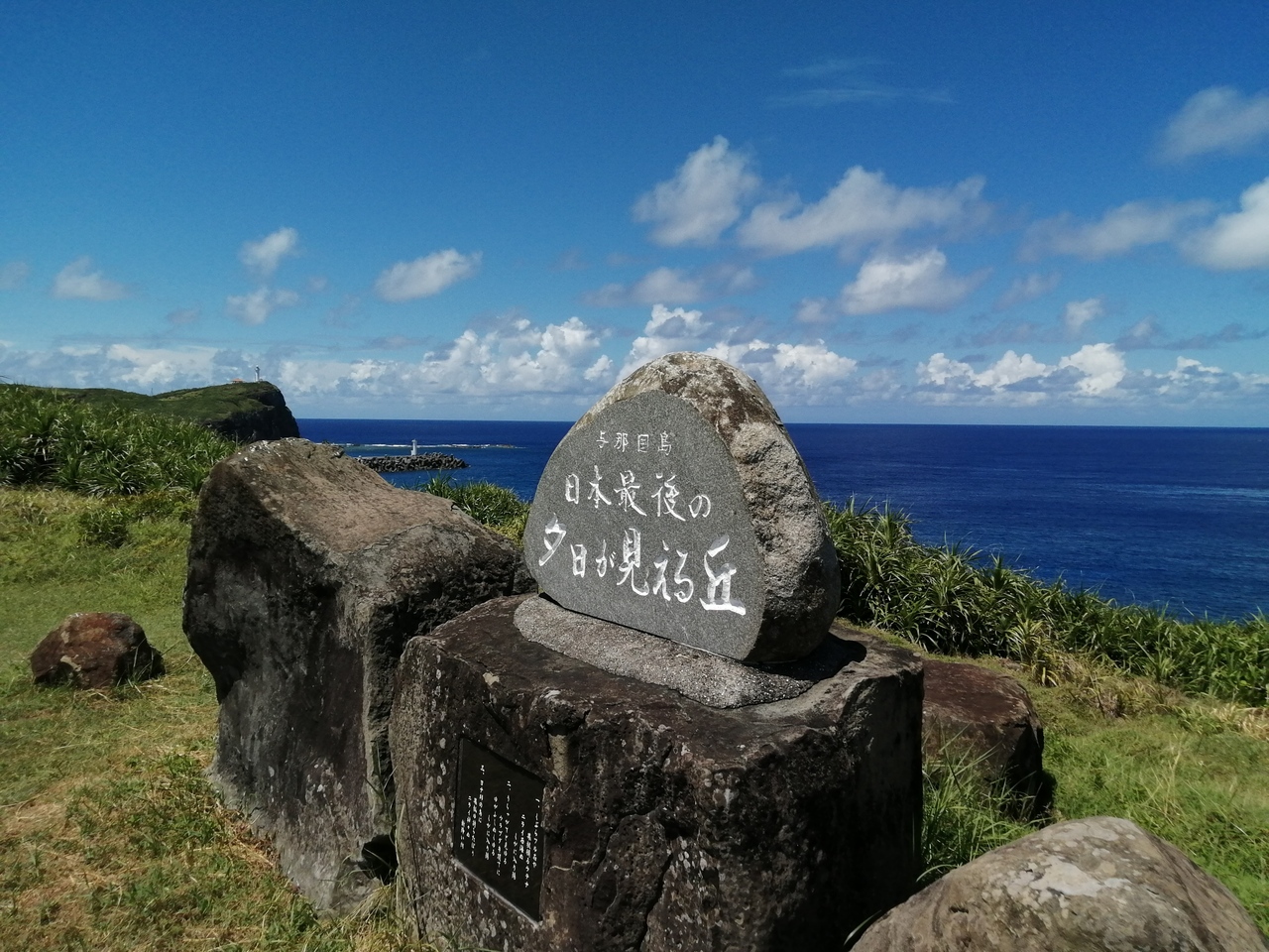「久部良バリ」の駐車場にある数段の階段を上がって左手方向へ。案内板はありませんが80mほど進むと「日本最後の夕日が見える丘」に到着です。立派な石碑があります。