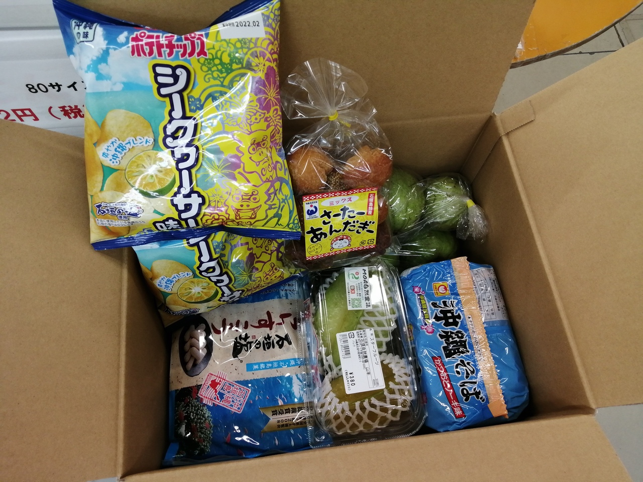 シークァーサーのポテチ2袋、マルちゃん沖縄そば1袋、ちんすこう6袋。計2507円