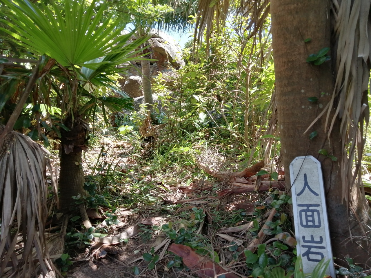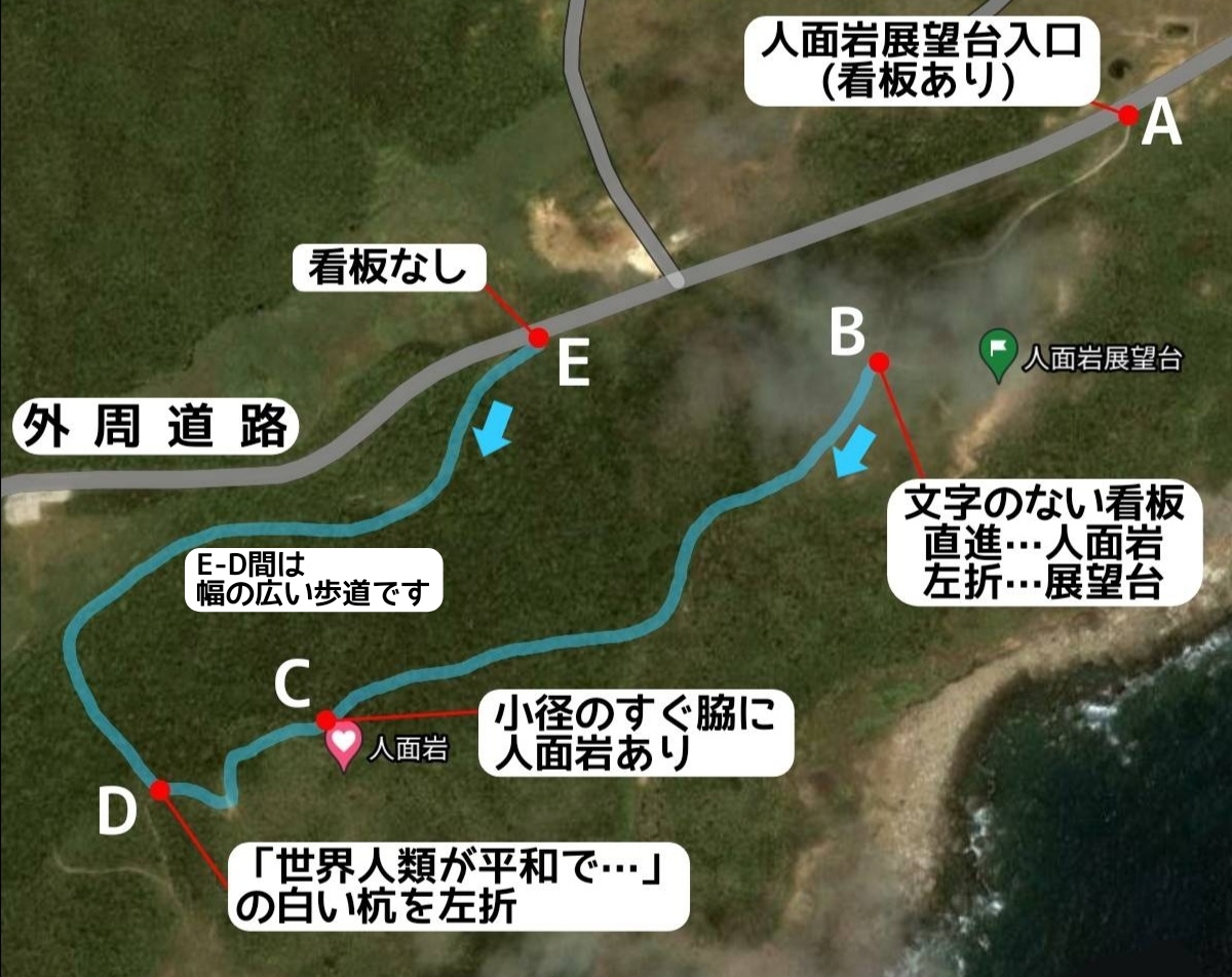 しかーし、行き方があまり紹介されていない。実際に私が行ったので詳しくご紹介いたします。「人面岩展望台から」と、「外周道路から」の2つのルートがあります。結論から言うとどちらも一応、“小径”はありますが草が超ボーボーでかなり困難です(季節によるかも)。私もビビりながらなんとか突破しました。どちらかというと「外周道路から」の方がややマシです。こちらをおすすめします。写真の地図で説明しましたのでご覧下さい。