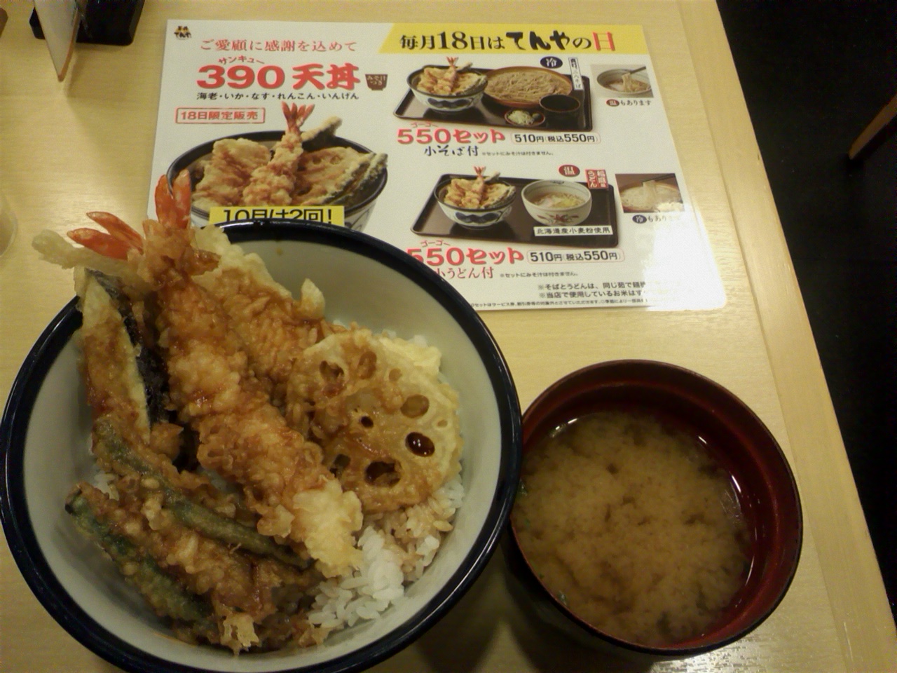 毎月18日は、てんやの日ということで、サンキュー天丼390円が食べれました。