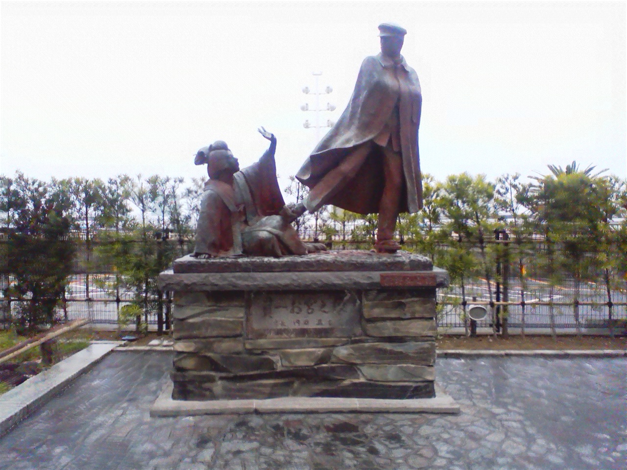 JR熱海駅から徒歩で20分程、国道135号線脇の砂浜と道路の間の公園に、小説 金色夜叉の「貫一 お宮の像」がありました。