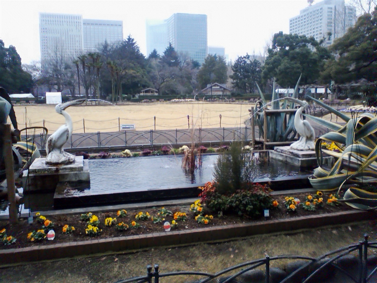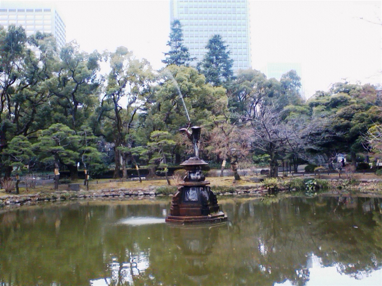 日比谷公園の祝田通り側、霞が関側の霞門から入ってすぐの場所にある、雲形池の真ん中にあるのが、鶴の噴水。