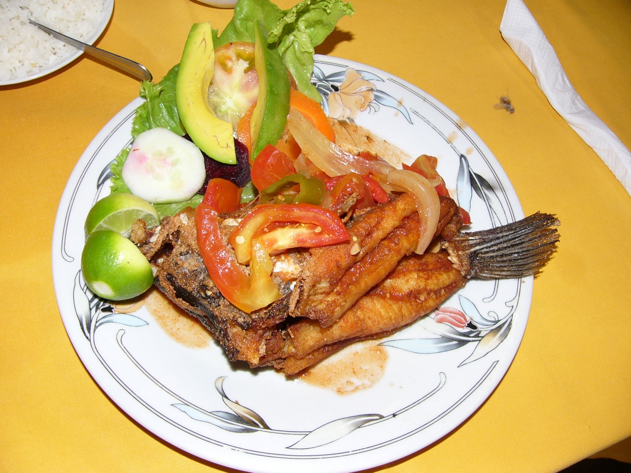 マナグアからグラナダまでは車で1時間半。Las Colinas Surという名前。ガポーテの姿揚げでは有名。オープンエアのみ。魚のサイズが3種類ある。一番小さいサイズでご飯・フライドポテト・トルティージャ・サラダがついて90コルドバ(約600円)。 カリカリして頭の骨まで食べられそう。おいしかったでーす!