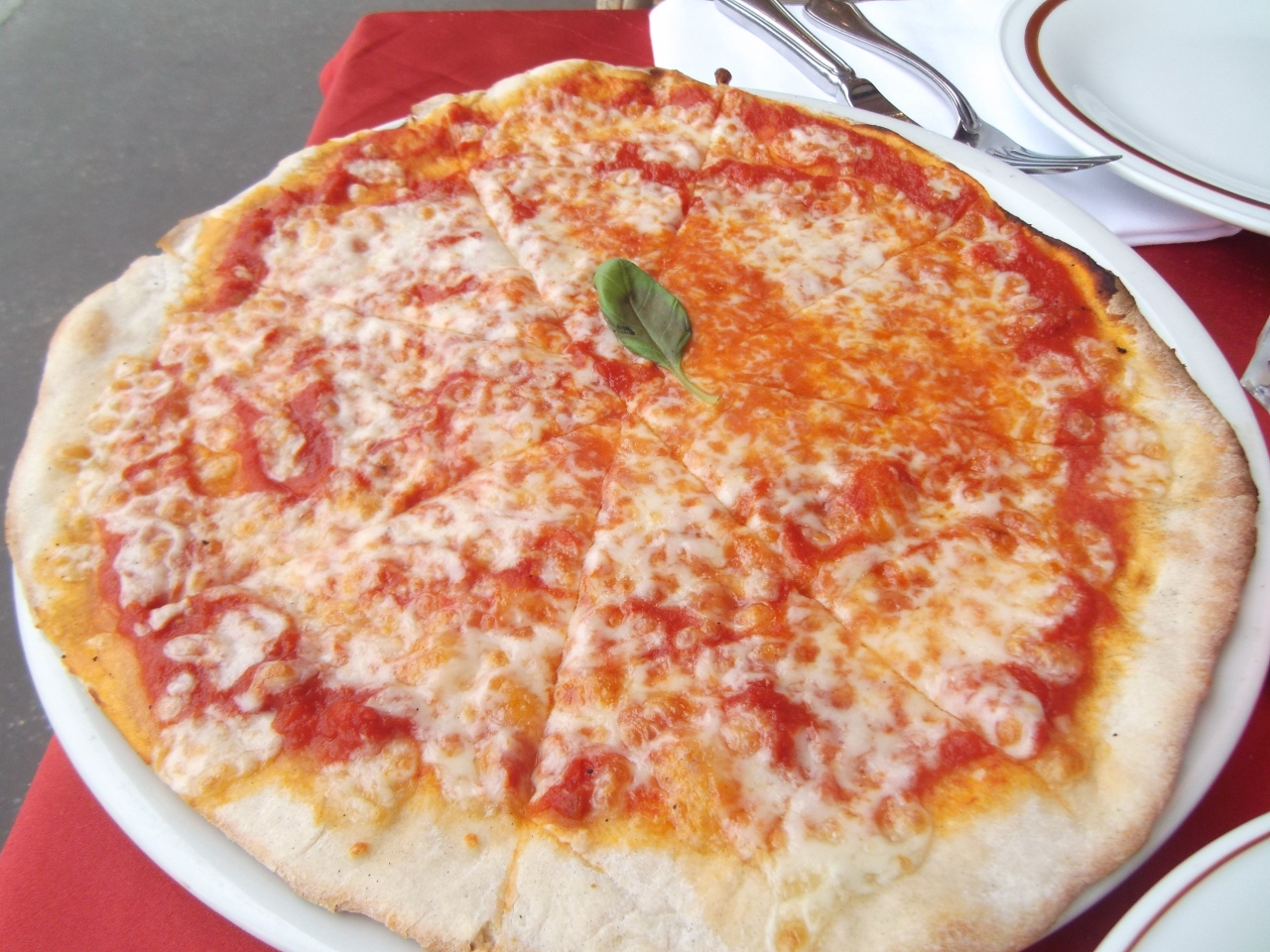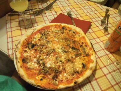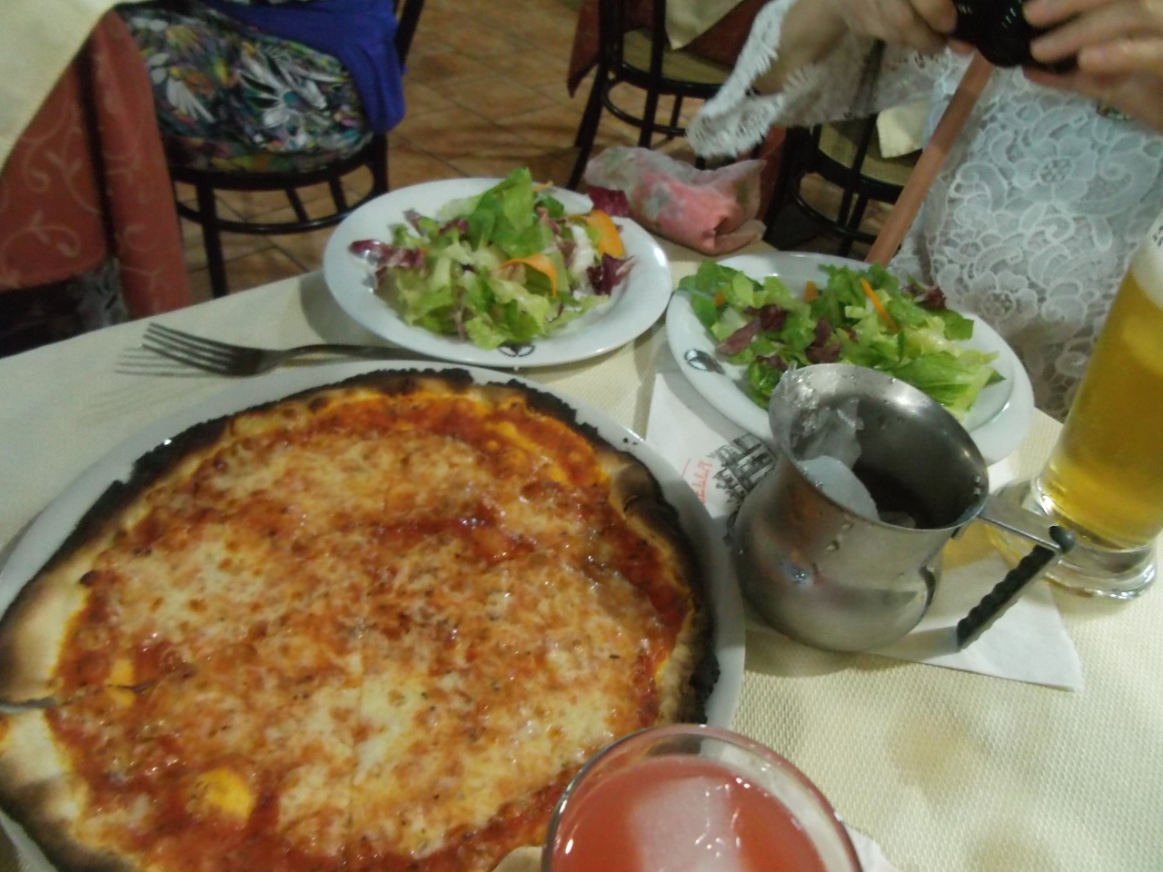 トラットリアなので、アラカルトで食べました。ネットゥーノの噴水の前?だからか、海鮮ピザ、シーフードピザを注文して、デカンタでハウスワインの白はおいしかったです。大道芸が多いので、途中、バク転する集団がきて、賽銭箱を持ってきます。