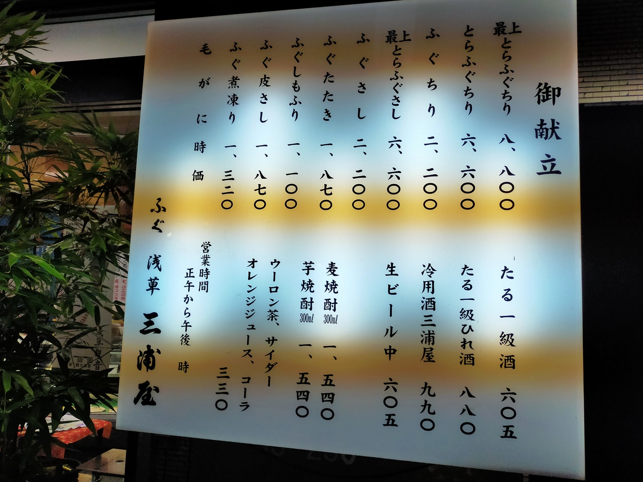 ふぐ料理の専門店でとらふぐを出していただけます。こんなに洗練された美味しいお刺身と鍋は世の中にないでしょと思うくらいの絶品です。早めに行ったら先客はおらずゆっくりカウンターでてっさとてっちり鍋をいただきました。それぞれ1人前をたのんで、1万円で収まりました。現金のみのお店で、駐車場はすぐ近くのところはカード可ですが、土日祝日は一時間800円しましたので、周辺に比べて割高です。それならば雷門地下駐車場に停めて歩いていくのも良かったなと思いましたが…