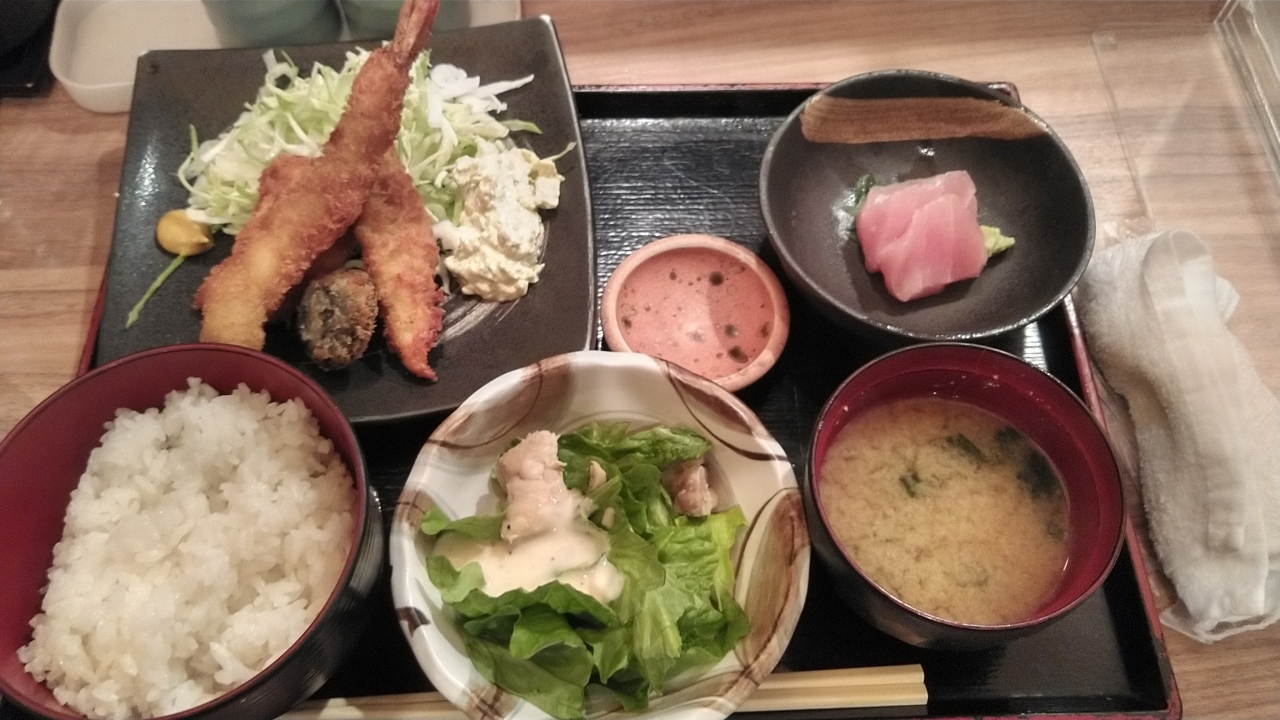 オススメの海鮮丼と行きたいところでしたが、ガッツリ食べたいという事で週替りのフライ定食(980円)でいきました。(エビ、アマダイ、穴子のフライでした)