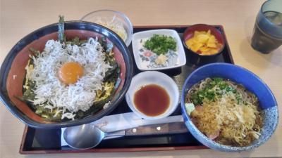 ごはんの上に錦糸卵と刻みノリが掛かり、その上のに黄身をのせたシラスがたっぷり載っているのに、刻みネギと摺りショウガを醤油に合わてから掛けて、これを混ぜて食べます。