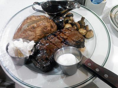 ビールにオニオンスープ、NYステーキで45ドルとちょっと値が張りますが空港価格と割り切れば・・・