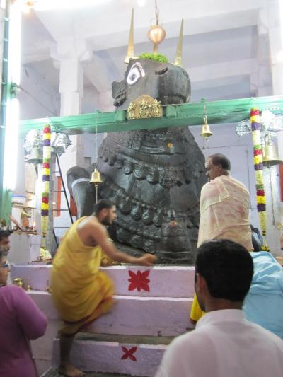 なんと一枚岩から作成したという巨大な牛の像(Nandi:ナンディ)ーが祀られている。