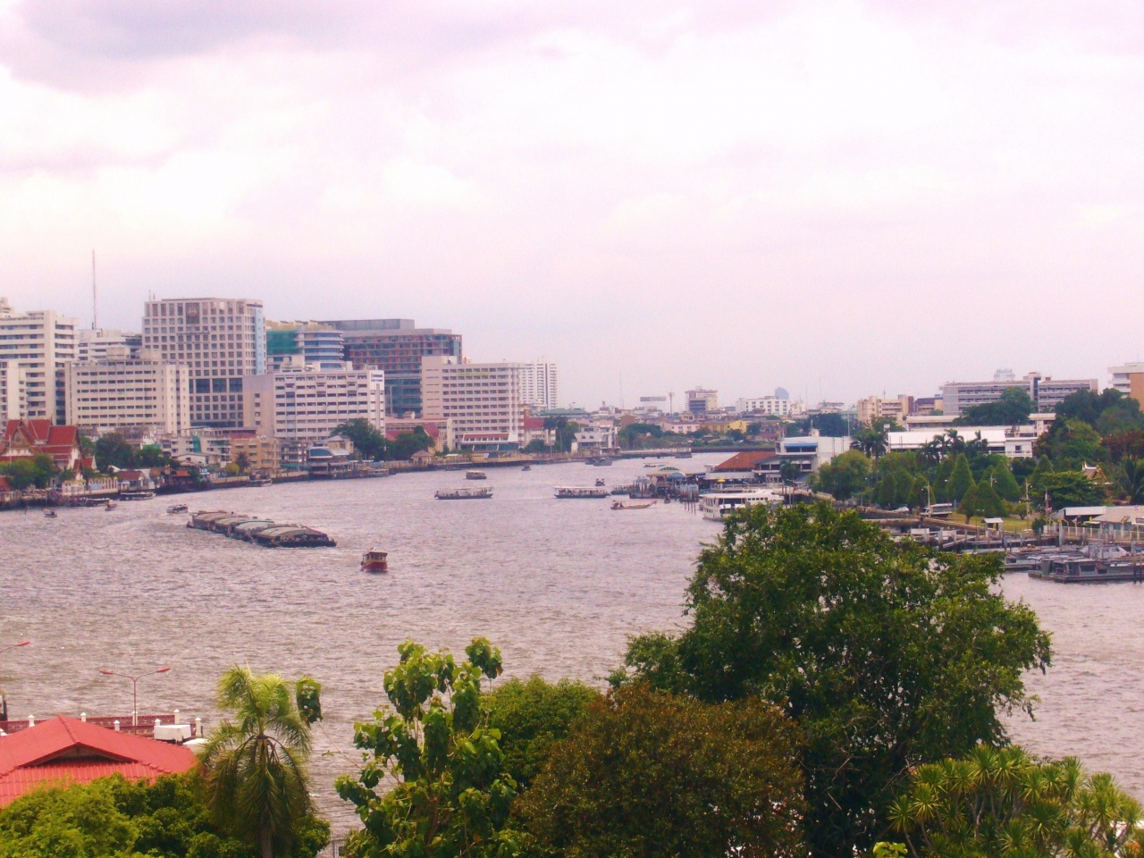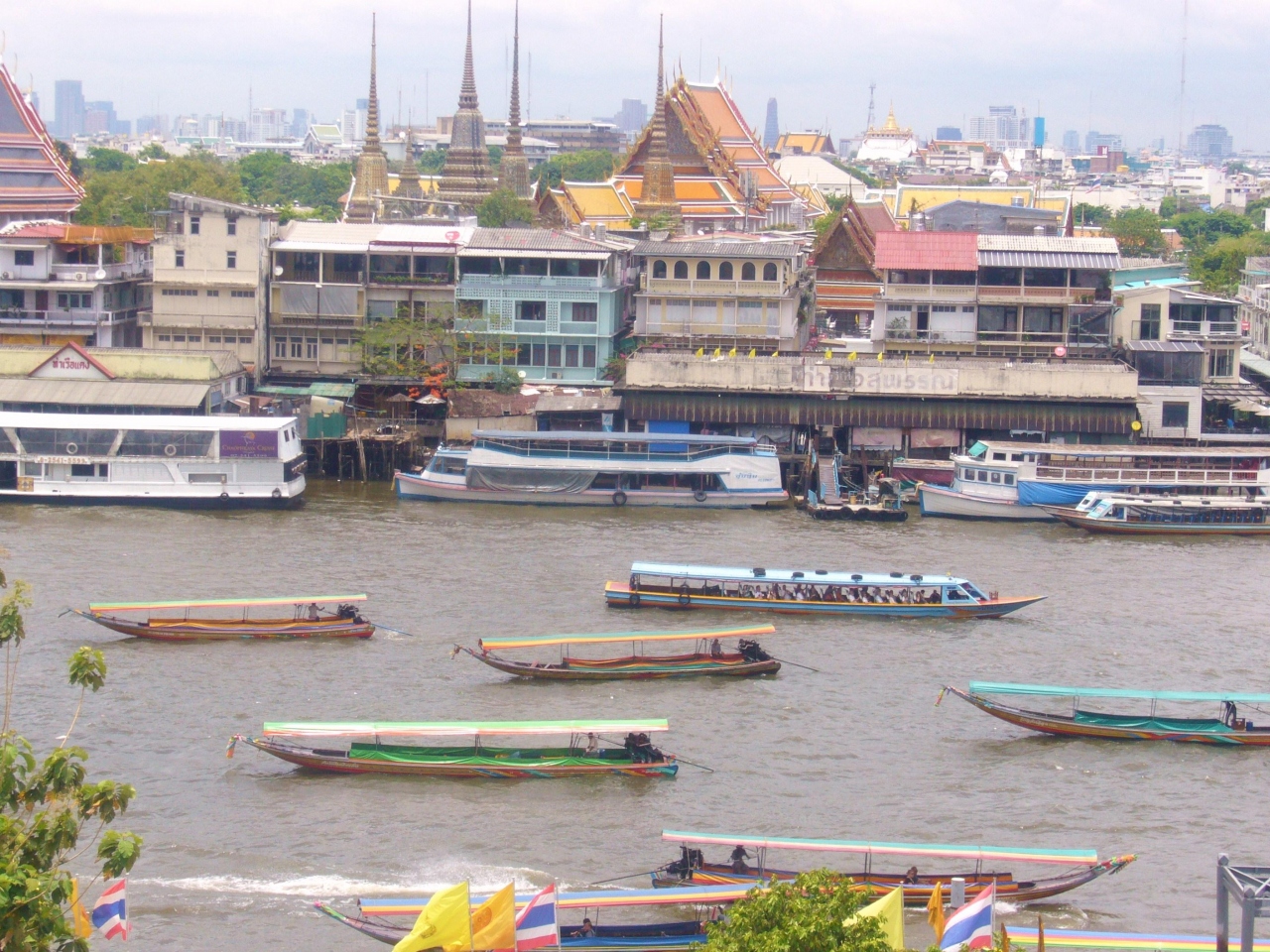 チャオプラヤーを行き交う船や対岸のワット・プラケオやワット・ポーも見えます。