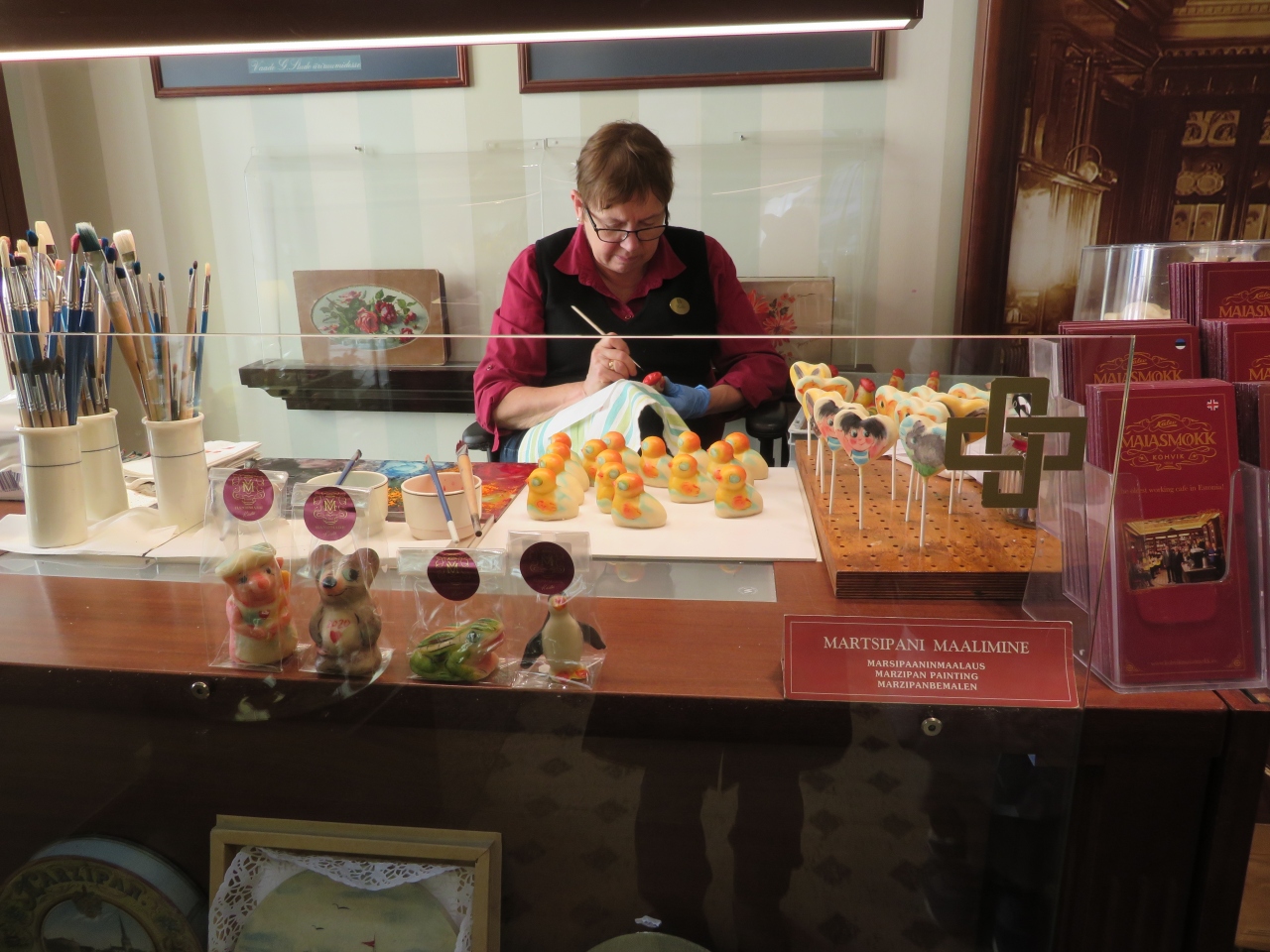 聖霊教会の向かいにあり、アクセスはしやすいです。最初はチョコレートの販売店だと思い入店したところ、カフェ兼マジパン作成が見れるようになっていました。ガラスのショーケースには色とりどりのマジパンで作られた動物や植物などが並んでいます。実演もしていました。