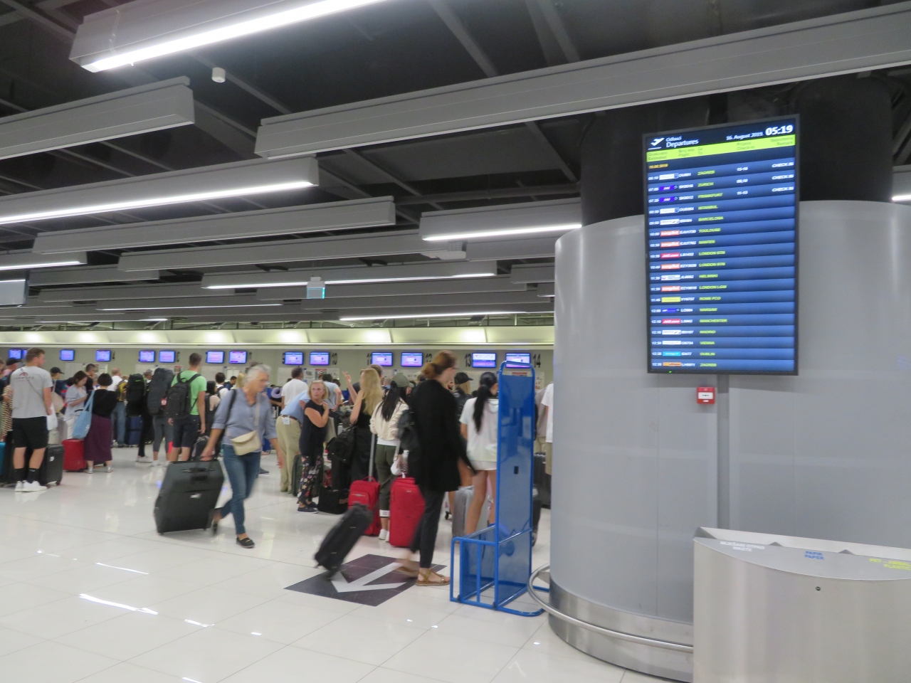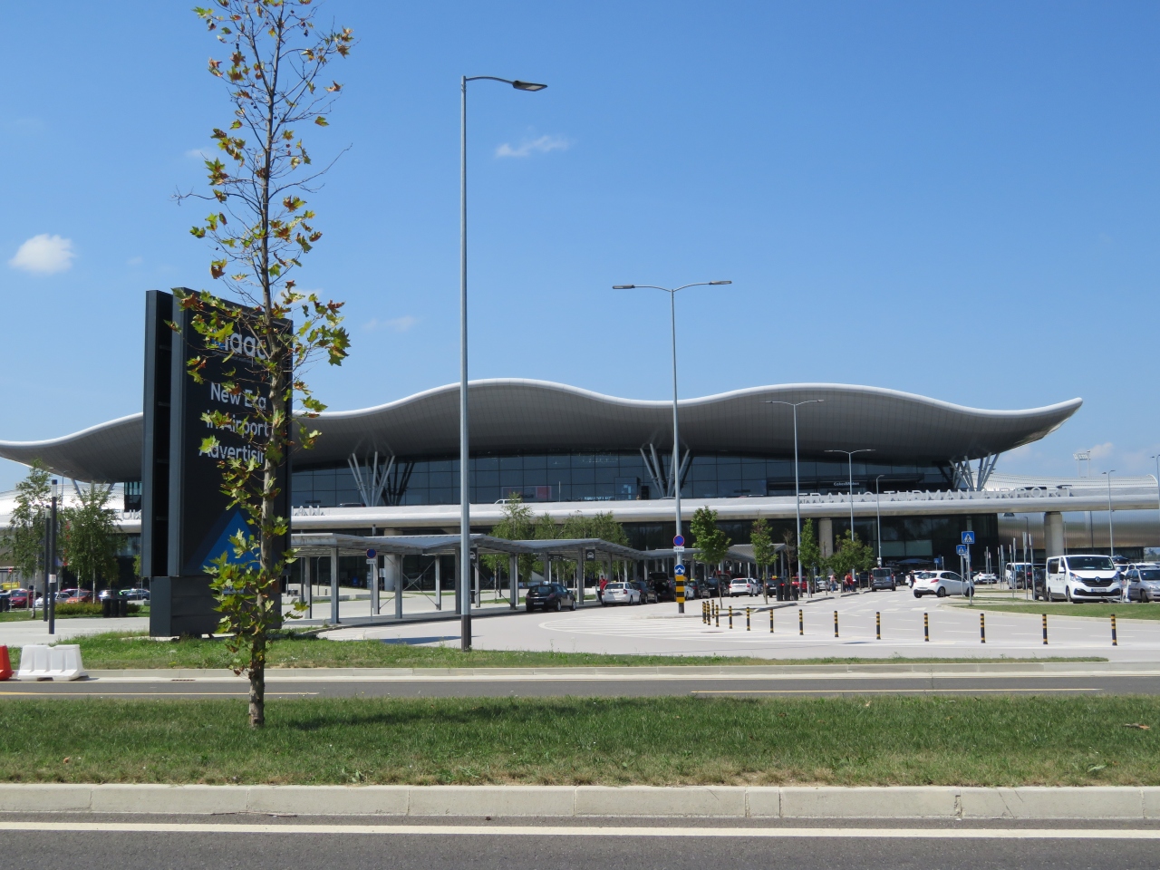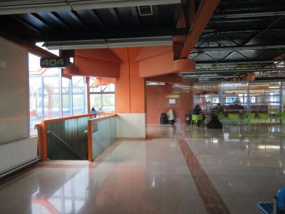 市街地から遠いです。空港のシャトルバスは長距離バスターミナルから出ていますが、始発が4:45です。時間通りバスが発車しないこともあるので、ホテルから空港のタクシーを利用すれば約35ユーロです。市街地から空港まで30分ですが、市街地を通るので、45分以上かかることもあります。空港には店は少な目で、給水機もありません。バスに長時間のるよりは、飛行機の方がいいかも知れません。カウンターではなく、機械でチェックインして搭乗券を手にした場合、荷物だけを預けるカウンターに並ぶと時間のロスがありません。