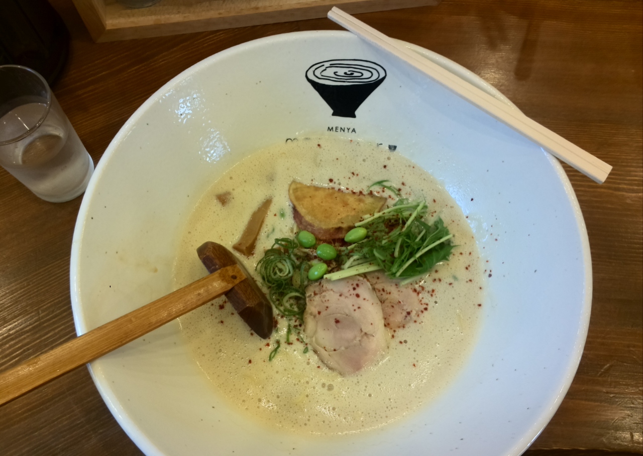 他店に行く予定でしたが、行列長く待つ時間がなかったので、こちらを利用しました。つけ麺が有名のようでしたが、中華麺を注文。豚骨の煮干し出汁で、美味は美味ですが、私にはやや脂が強いと感じました。手元に料理が届いた段階で、スープの脂が固まり始めていた位くらいです。駅から少し歩いたところにあります。