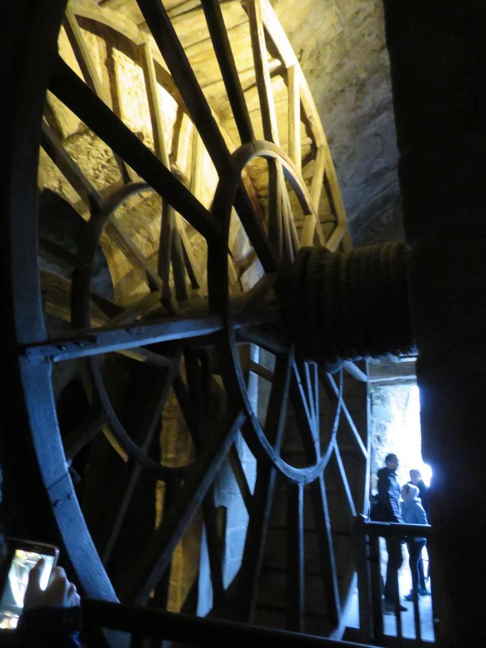 モンサンミッシェル建設に使われた石材などを持ち上げるためにつかわてた滑車(中に奴隷を入れて歩かせた、車輪のようなもの)が残されています。滑車の車輪だけでなく、その車輪につながる太いロープも見ることができます。どれほどの時間と労力が必要だったのか、読み取ることができます。