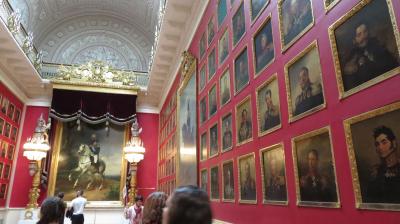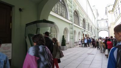 個人旅行者は事前にオンラインチケットを入手すべきです。それでも入場30分前からオンラインチケット専用入り口でも長蛇の列です。入場料は現地では700ルーブルでした。所要時間は内容次第ですが、多くのツアーは要所の見回る2時間くらいのコースのようでした。主に2回にその要所があります。ガイドブックを参照し、現地で地図を手に入れ(日本語のものがあります)て観光しましょう。ちなみに、印象派の作品のある新エルミタージュは向かいの建物で、日本人ツアーは一切観光していませんでした。