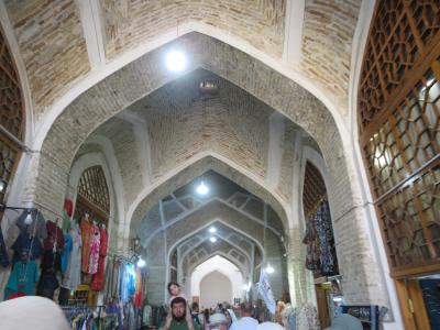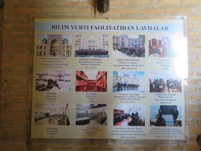 カラーンモスクの正面に位置しています。きれいな門、青いドームが素敵な神学校です。内部には入れませんが、格子窓越しに中庭を見ることができます。学校での取り組みなどがパネルで表示されていました。1階が先生の部屋なので、入り口を小さめに作ってあるそうです。そうすれば、生徒は自然と頭を下げて先生の部屋に入ることになるからだそうです。