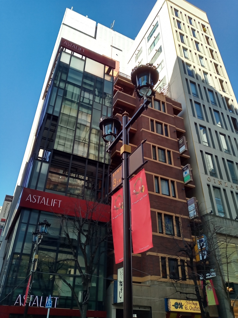 東京・銀座の『銀座並木通り』も新年の御祝いムードとなっていて、街灯に『A HAPPY NEW YEAR』という垂れ幕が飾られていました。ただそれだけなのですが、御洒落な街灯だけあり、銀座らしい品の良さを感じられる演出となっています。御洒落な銀座並木通りがより、御洒落な雰囲気となっていて散策もより楽しくなります。
