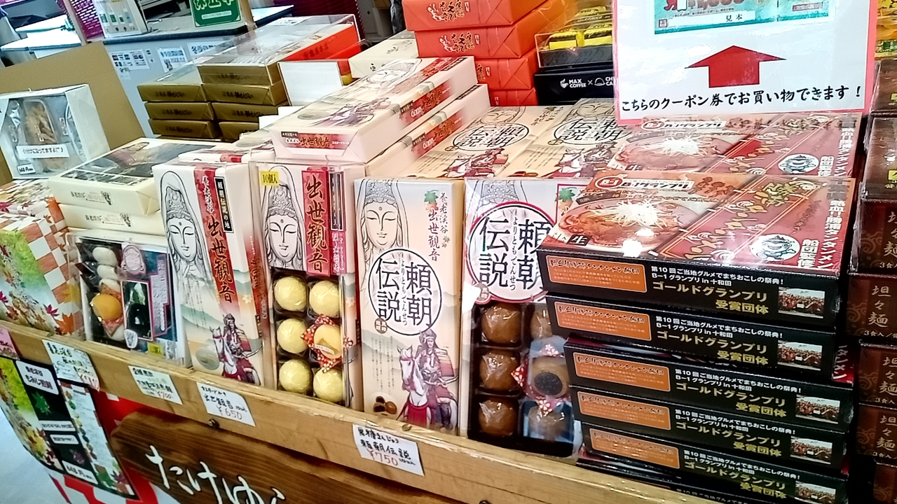 千葉県・大多喜にある『道の駅 たけゆらの里おおたき』を訪れました。館内に入ってすぐの場所に『出世観音』のおまんじゅうなどのお土産商品が販売されていました。
