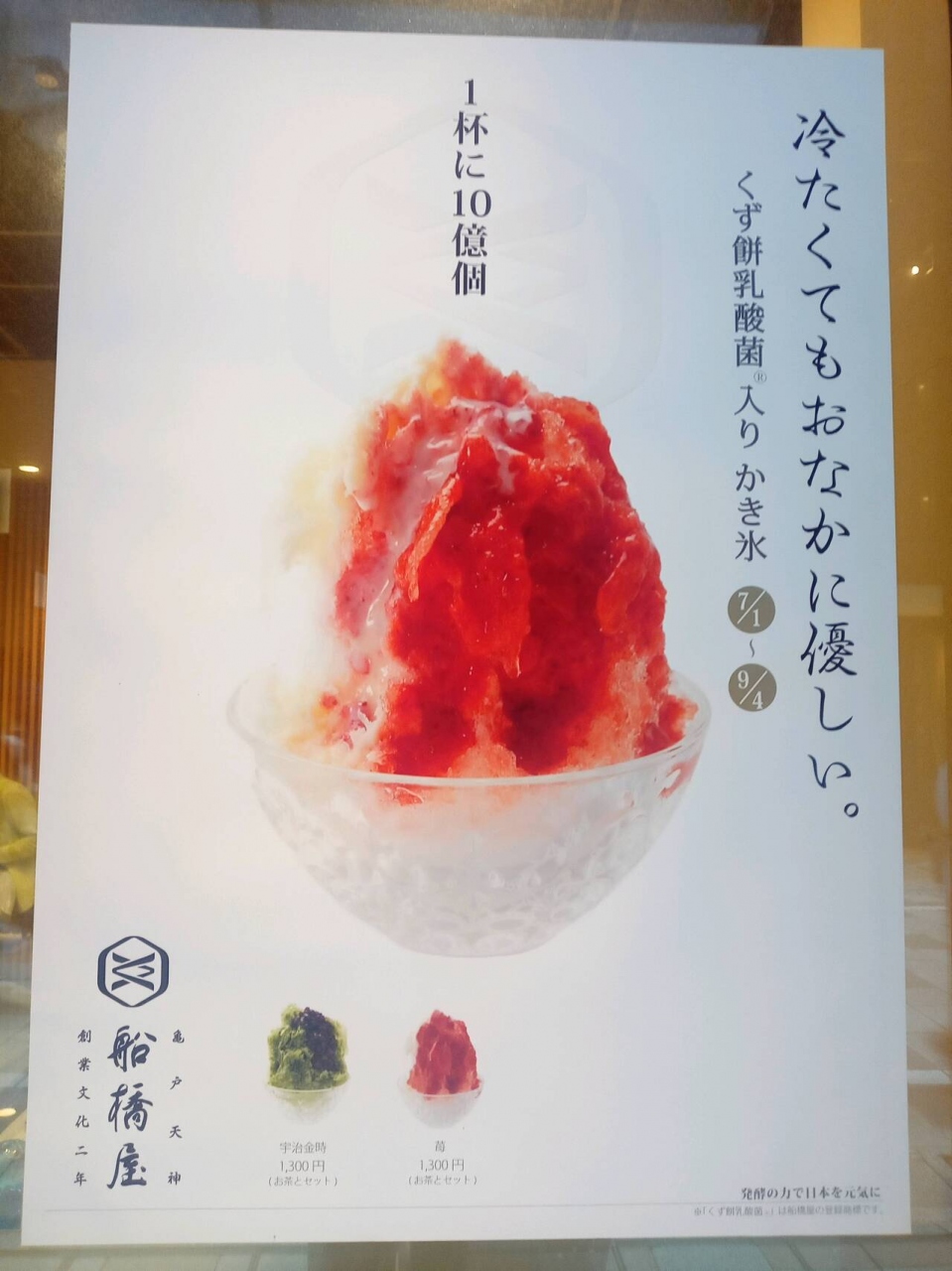 東京・日本橋の『COREDO 室町』の1Fに出店している『船橋屋 コレド室町店』にて、期間限定にて『かき氷』がいただけます。『くず餅乳酸菌入り かき氷』となっていて、『一杯につき10億個の乳酸菌』が入っているそうです。老舗 くず餅専門店の船橋屋さんならではのかき氷となっています。