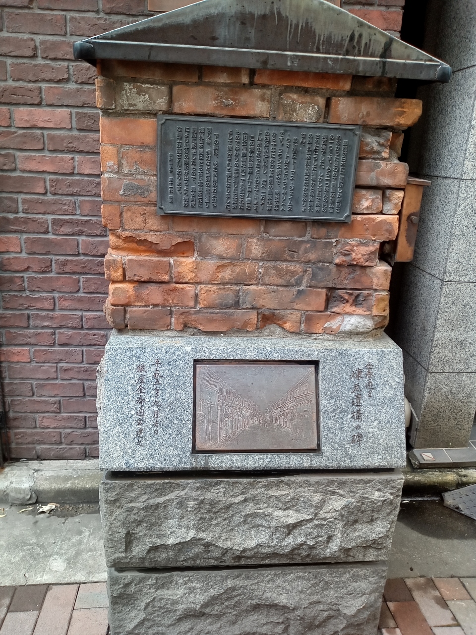 東京・銀座の『金春通り』に『金春通り煉瓦遺構の碑』があります。金春通りは、トーマス・ジェイムス・ウォートルス氏が設計したフランス積みの煉瓦街があったそうです。