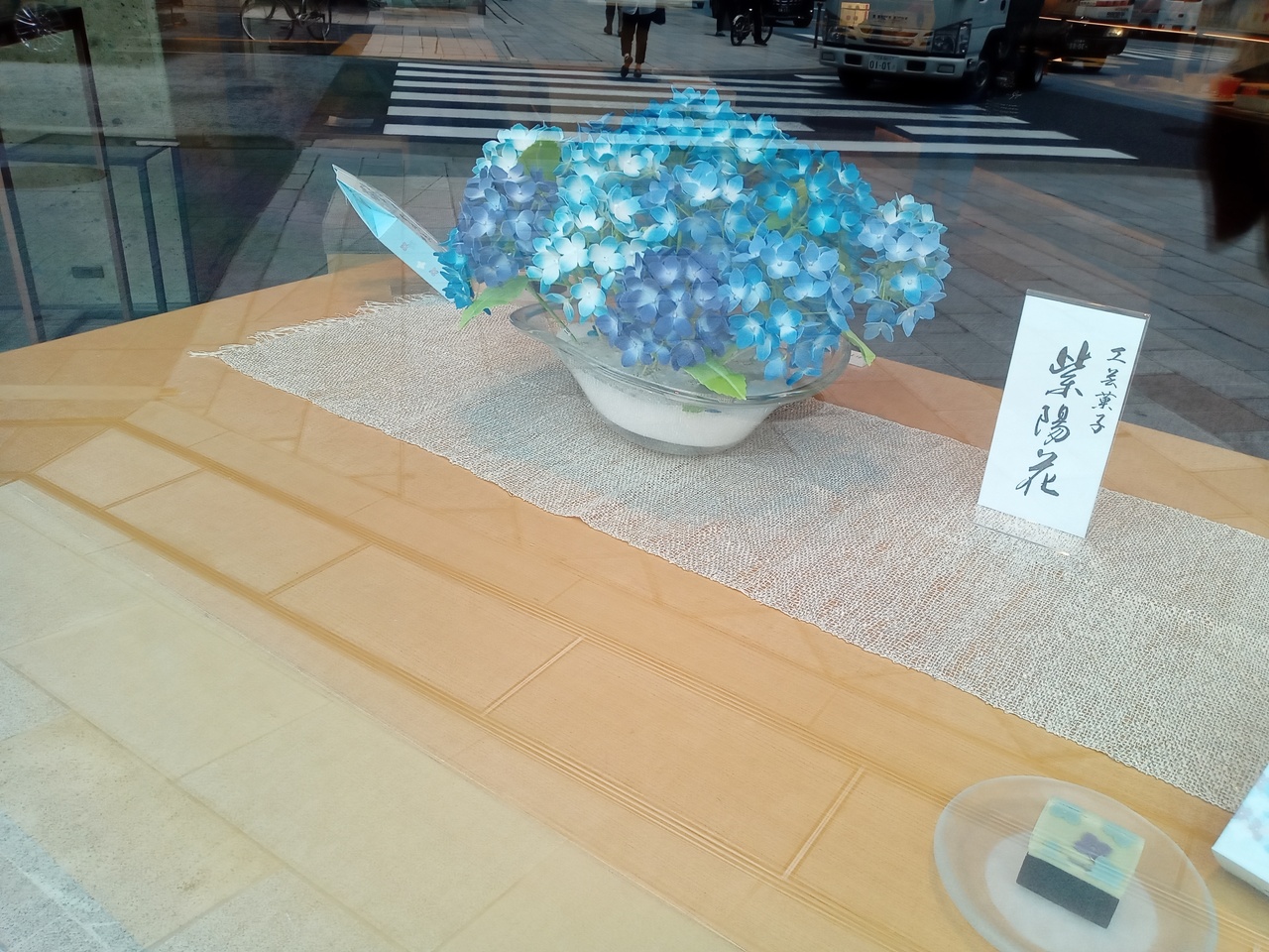 東京・日本橋の『COREDO 室町』に出店している『鶴屋吉信 TOKYO MISE』の店内に「工芸菓子」が飾られています。「あじさいの工芸菓子」が飾られていて、あじさいが綺麗に咲いている今の季節にぴったりで、とても素敵です。御菓子にて、季節を感じることが出来ます。
