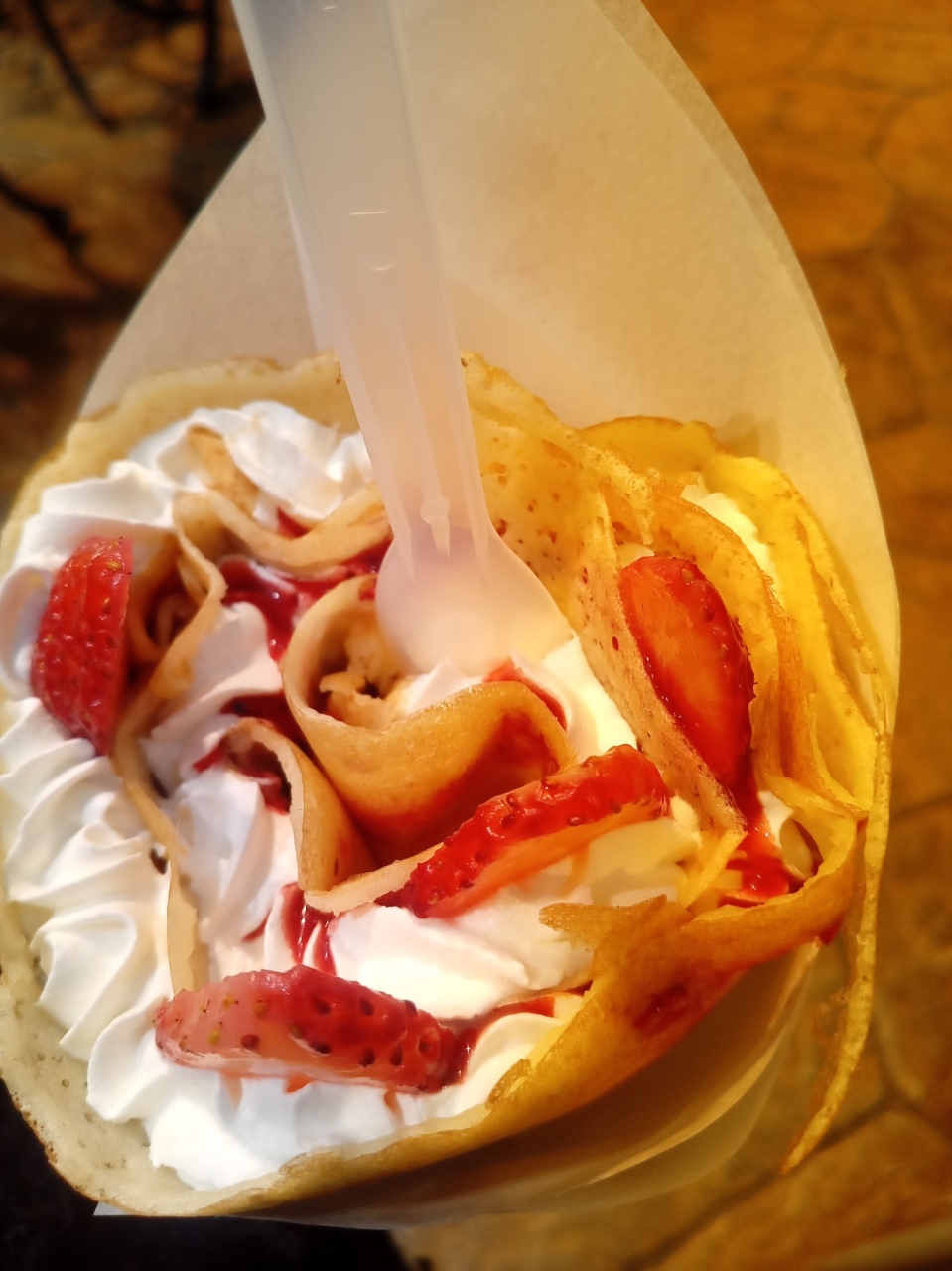 『モミ アンド トイズ お台場ヴィーナスフォート店』にて、クレープをいただくことにしました。いつもよりもお客様がとても多く、待ちました。美味しいひと休みです。- 旅行時期