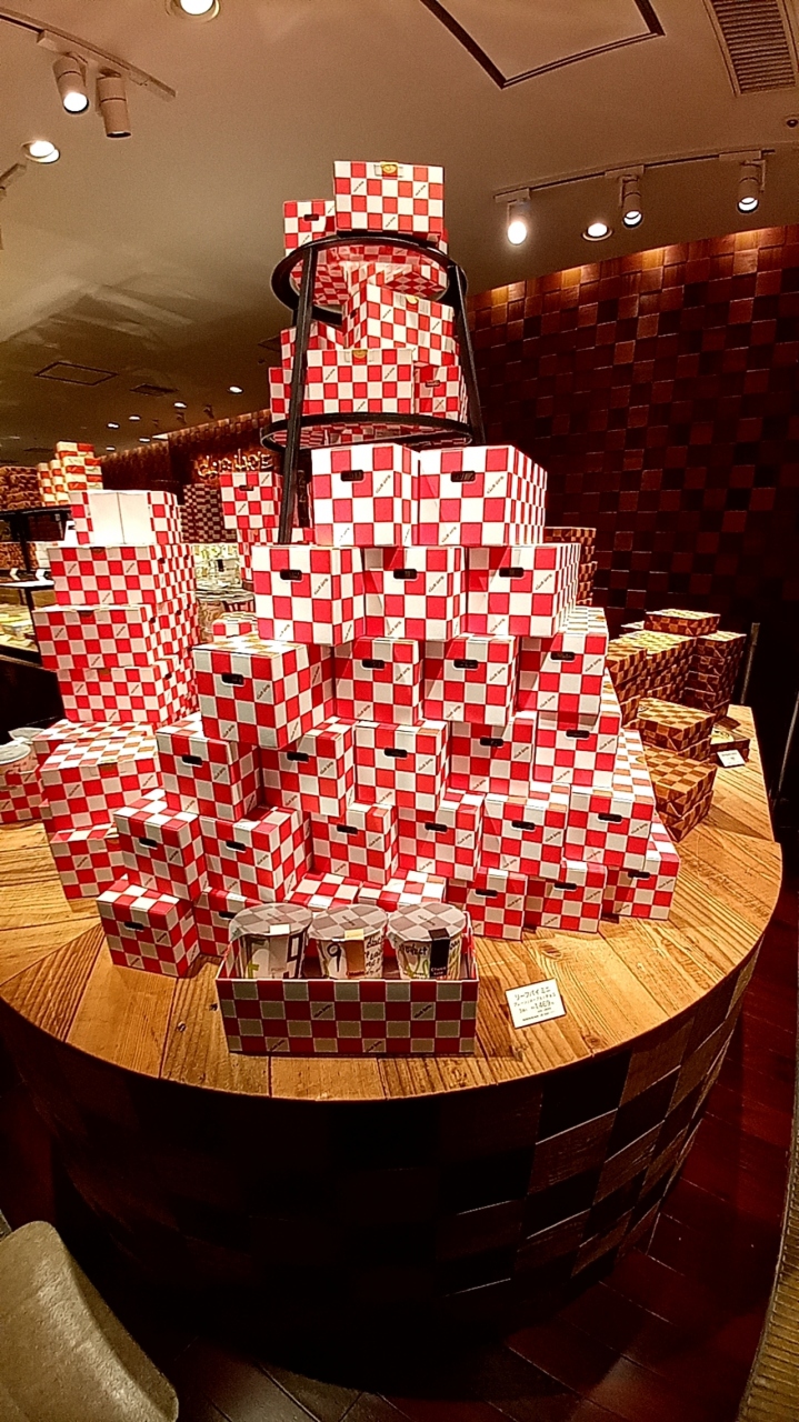 東京・日本橋の『日本橋三越本店・新館』のB2Fに出店している『クラブハリエ 日本橋三越店』のとても人気があるバウムクーヘン。御正月を迎え、新年らしい『紅白』のちょっと御目出度いパッケージボックスが用意されていました。気持ちも明るくなるパッケージボックスです。