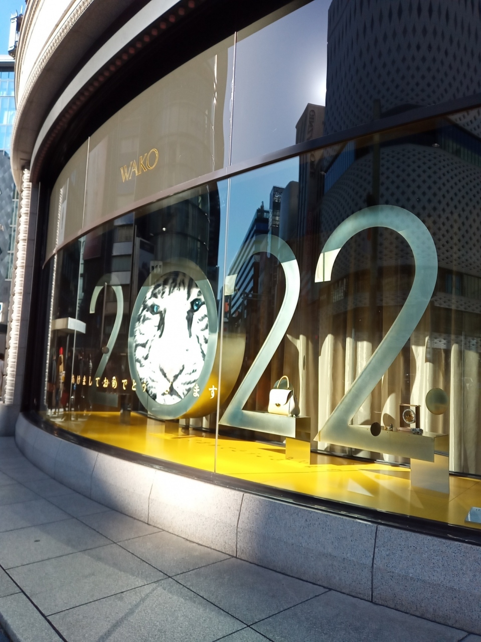東京・銀座の交差点前にある『銀座 和光 (本館)』は、ディスプレイもとても素敵です。毎年新年を迎えると干支をモチーフにした御正月のディスプレイとなります。今年の干支は『寅』。まるの中からホワイトタイガーが顔を出しています。