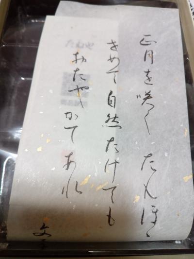 いつもは、菓子箱に稲穂が付いていて、「福飴」を手渡しにていただけていたのですが、コロナになってからは、稲穂も、福飴もなくなってしまいました。今年は、蓋を開けてみると「書(栞)」が入っていました。- 旅行時期