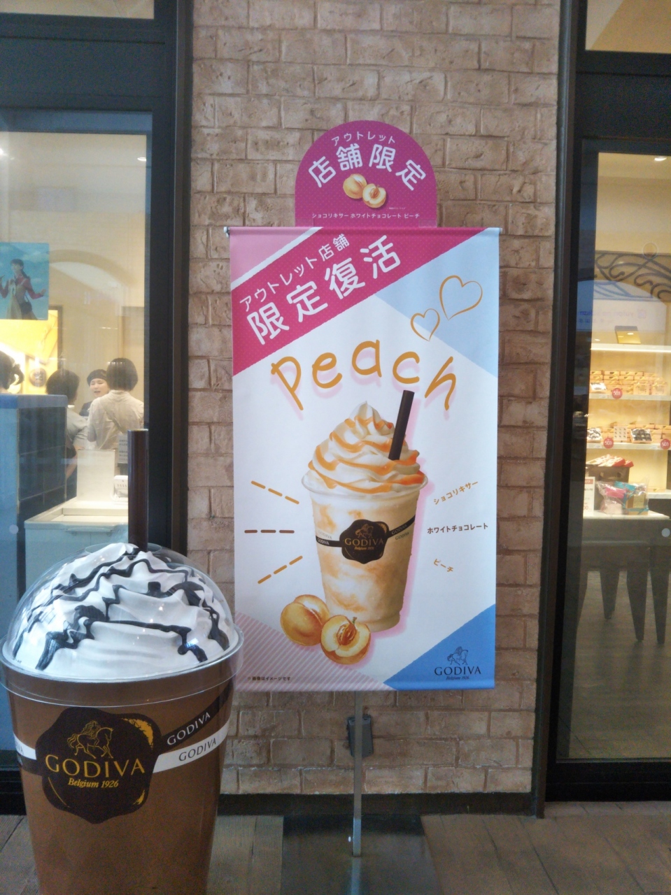 ゴディバでは、アウトレットショップ限定の商品が販売されています。「ショコリキサーのピーチ」が復活販売されていました。- 旅行時期