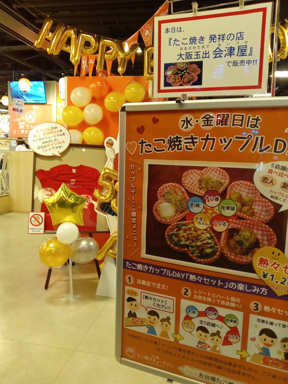 東京・お台場の「デックス東京ビーチ」のシーサイドモール4Fにある『台場たこ焼きミュージアム』は、毎週水曜日&金曜日が「カップルたこ焼きDay」となっていて、5店舗のたこ焼きが食べ比べ出来るようになっています。当番のお店で購入し、各店舗を周りたこ焼きをいただくシステムとなっています。