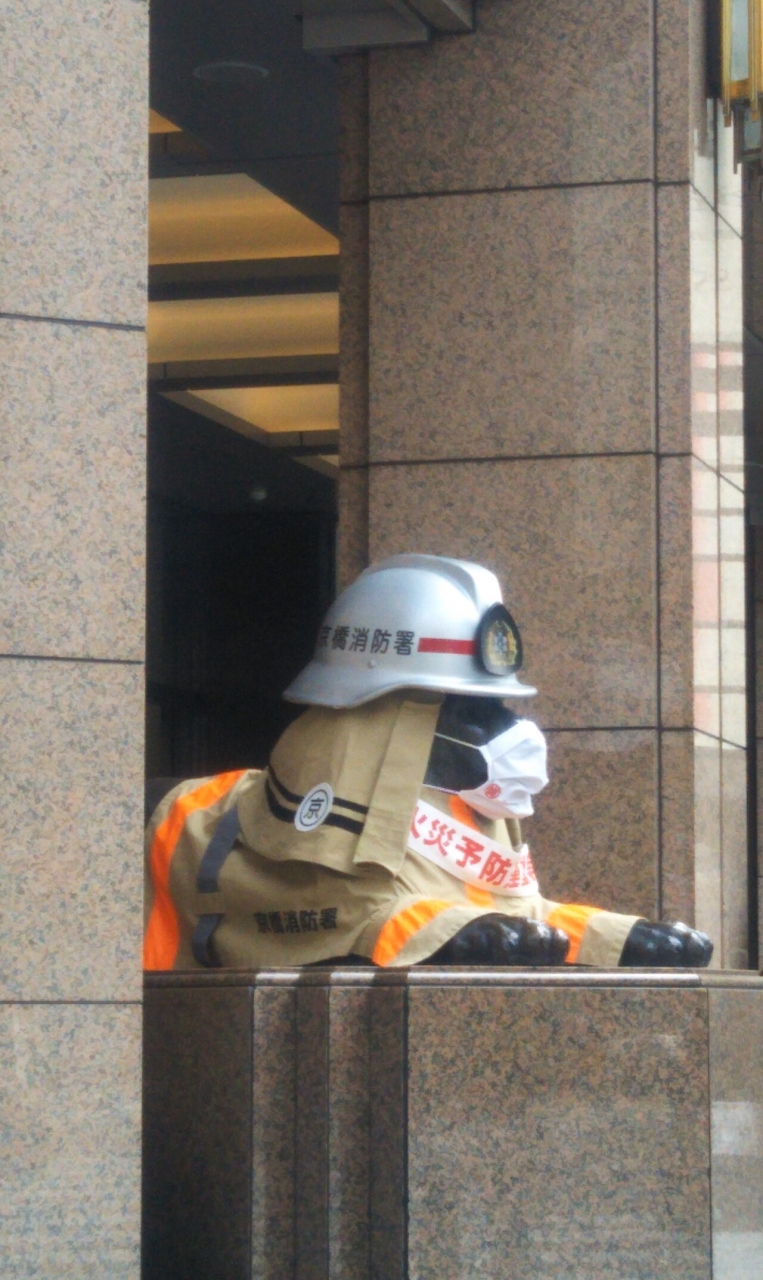 東京・銀座の交差点前にある『銀座三越』の門前にて番をしているような「銀座三越のライオン像」。訪れた日には、防火衣及び防火帽子を着用して消防士に変身し、火災予防をPRしていました。