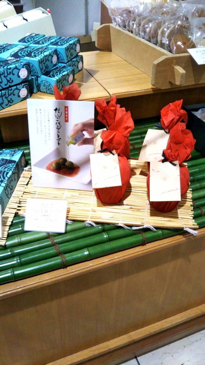 東京・日本橋の『日本橋三越本店 本館』のB1Fに出店している『たねや 日本橋三越店』は、和菓子専門店ですが、ちょっと斬新な『だんごバジル&トマト』が店舗限定にて販売されています。バジルを練り込んだおだんごに『トマトソース・オリーブオイル・粉末バジル』をかけていただくという、目新しいおだんごです。