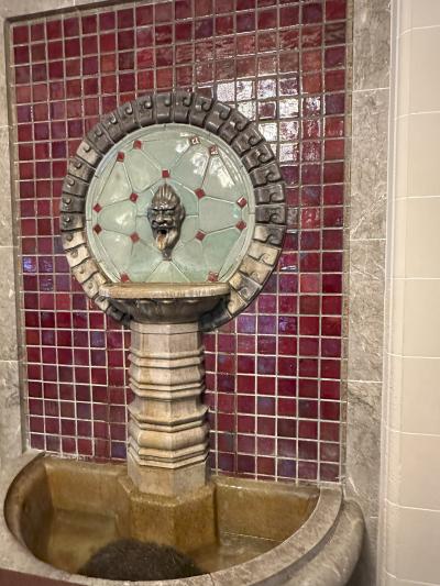 会館の中に入ると、玄関正面の壁面に会館を災いから守る魔除けの「邪鬼」が...