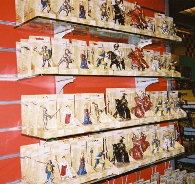 似たようなおもちゃは、マルボルク城のギフトショップにも売っていたと思いますが、ワルシャワのエルサレム通りのORBIS(もと国営の全国チェーンの旅行会社)本店の隣にある、子ども用品専門店SMYKの店内にも、写真のようなおもちゃがありました。どれも欲しかったのですが、見栄えがするということで、馬に乗って盾と槍を持った黒騎士と赤い騎士を買いました。小さい子ども向けのお土産を探していたのに、大人にプレゼントしました(ピアノの先生@)。価格はどちらも、46.90ズウォティでした。(1ズウォティ=約35円)